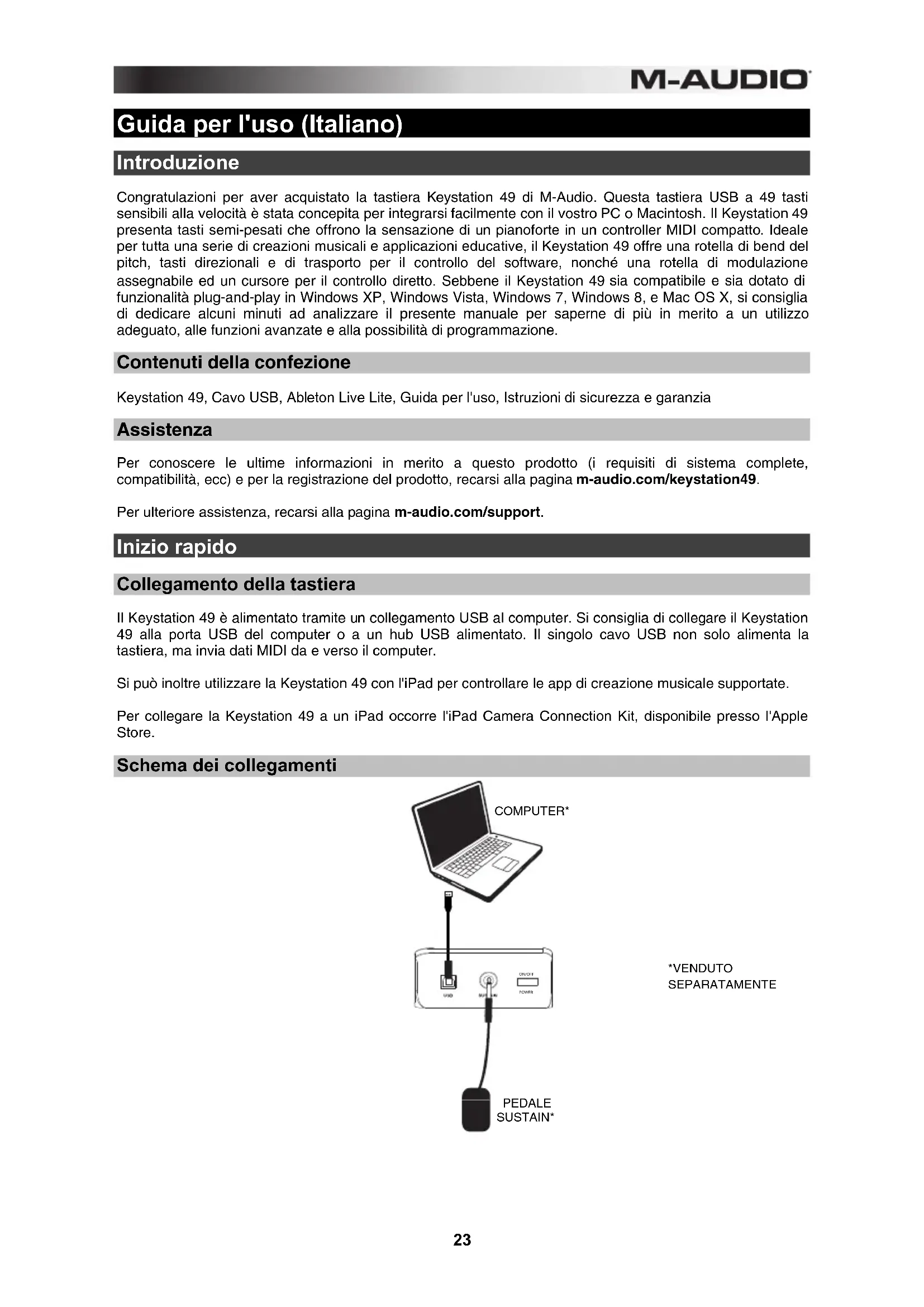 Contenuti della confezione Keystation 49, Cavo USB, Ableton Live Lite, Guida per l'uso, Istruzioni di sicurezza e garanzia Assistenza Per conoscere le ultime informazioni in merito a questo prodotto (i requisiti di sistema complete, compatibilità, ecc) e per la registrazione del prodotto, recarsi alla pagina m-audio.com/keystation49. Per ulteriore assistenza, recarsi alla pagina m-audio.com/support. Inizio rapido Collegamento della tastiera Il Keystation 49 è alimentato tramite un collegamento USB al computer. Si consiglia di collegare il Keystation 49 alla porta USB del computer o a un hub USB alimentato. Il singolo cavo USB non solo alimenta la tastiera, ma invia dati MIDI da e verso il computer. Si può inoltre utilizzare la Keystation 49 con l'iPad per controllare le app di creazione musicale supportate. Per collegare la Keystation 49 a un iPad occorre l'iPad Camera Connection Kit, disponibile presso l'Apple Store.