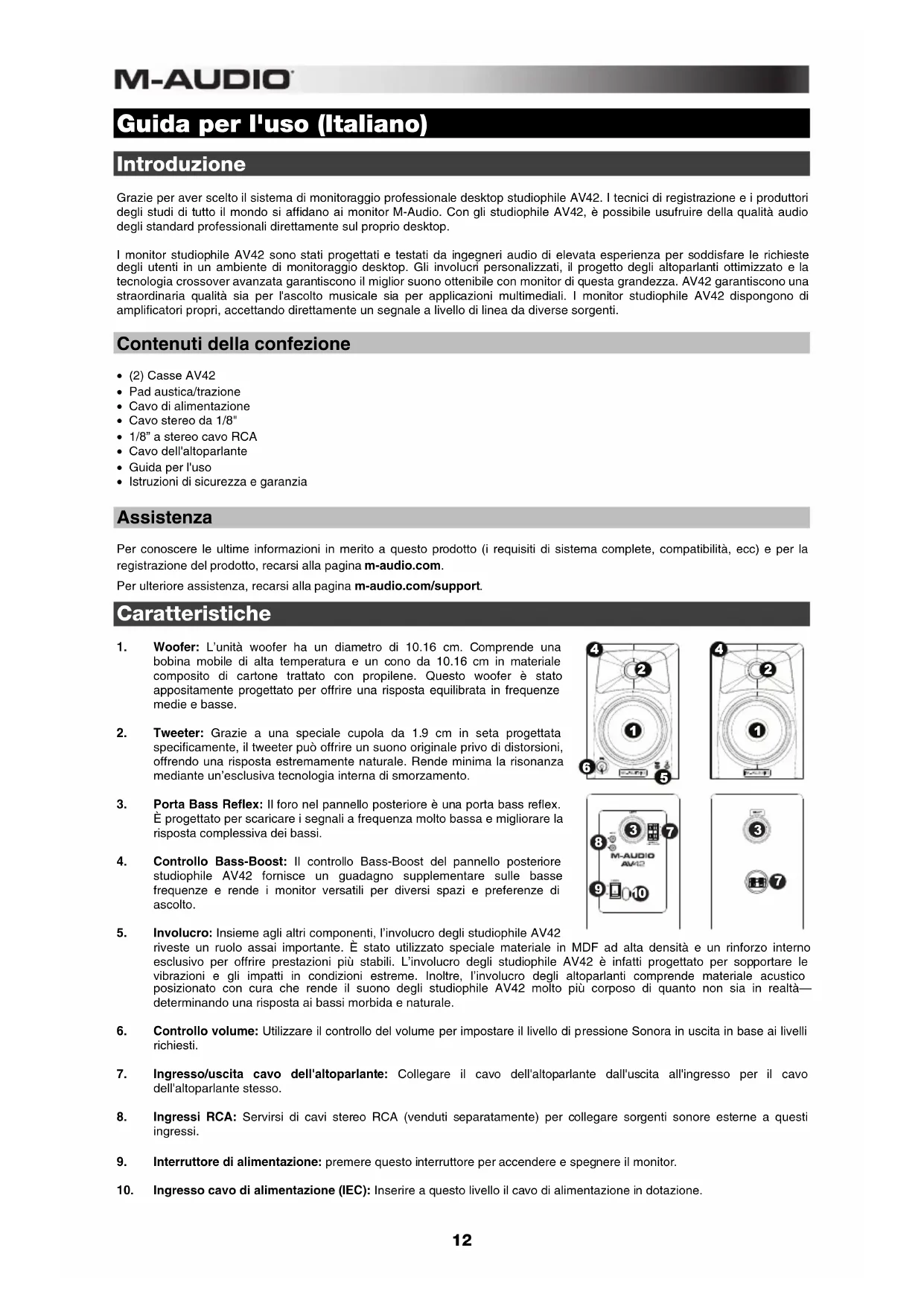 - (2) Casse AV42 • Pad austica/trazione • Cavo di alimentazione • Cavo stereo da 1/8" • 1/8” a stereo cavo RCA • Cavo dell'altoparlante • Guida per l'uso • Istruzioni di sicurezza e garanzia Assistenza Per conoscere le ultime informazioni in merito a questo prodotto (i requisiti di sistema complete, compatibilità, ecc) e per la registrazione del prodotto, recarsi alla pagina m-audio.com. Per ulteriore assistenza, recarsi alla pagina m-audio.com/support. Caratteristiche
