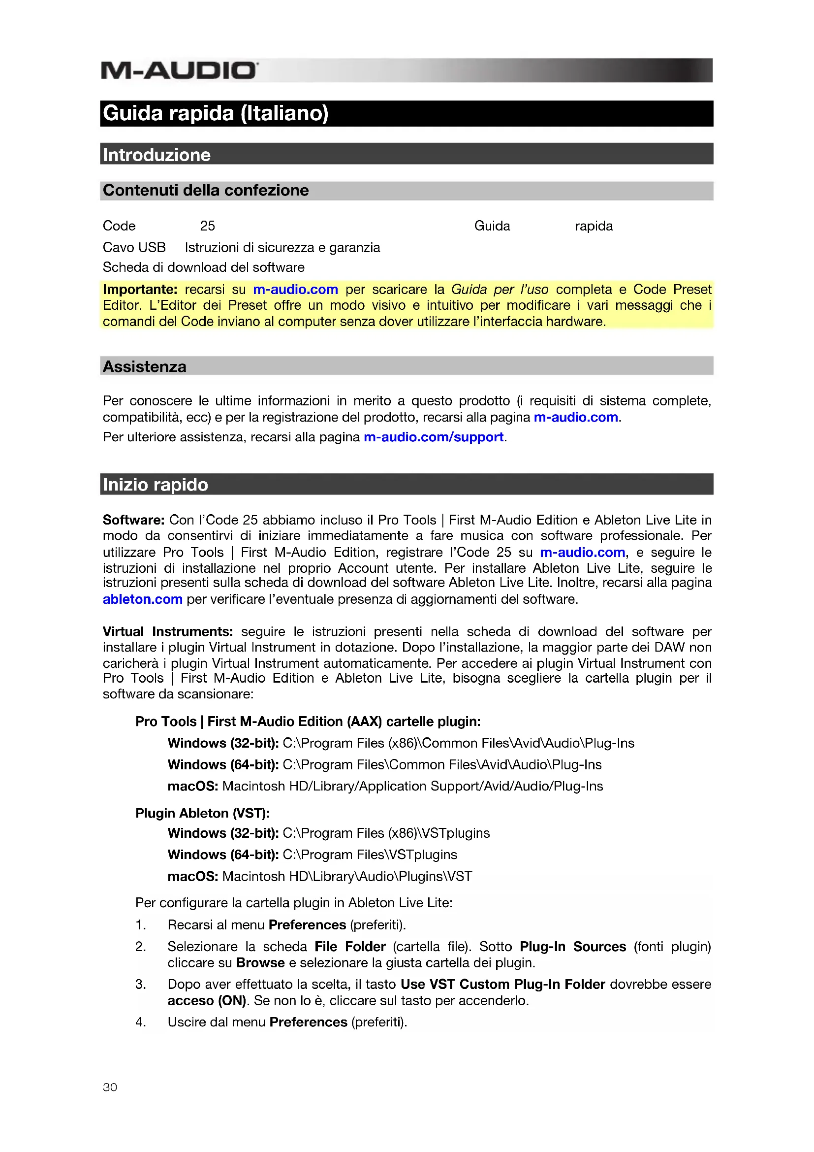 Guida rapida (Italiano) Introduzione Contenuti della confezione Code 25 Guida rapida Cavo USB Istruzioni di sicurezza e garanzia Scheda di download del software Importante: recarsi su m-audio.com per scaricare la Guida per l’uso completa e Code Preset Editor. L’Editor dei Preset offre un modo visivo e intuitivo per modificare i vari messaggi che i comandi del Code inviano al computer senza dover utilizzare l’interfaccia hardware. Assistenza Per conoscere le ultime informazioni in merito a questo prodotto (i requisiti di sistema complete, compatibilità, ecc) e per la registrazione del prodotto, recarsi alla pagina m-audio.com. Per ulteriore assistenza, recarsi alla pagina m-audio.com/support. Inizio rapido Software: Con l’Code 25 abbiamo incluso il Pro Tools | First M-Audio Edition e Ableton Live Lite in modo da consentirvi di iniziare immediatamente a fare musica con software professionale. Per utilizzare Pro Tools | First M-Audio Edition, registrare l’Code 25 su m-audio.com, e seguire le istruzioni di installazione nel proprio Account utente. Per installare Ableton Live Lite, seguire le istruzioni presenti sulla scheda di download del software Ableton Live Lite. Inoltre, recarsi alla pagina ableton.com per verificare l’eventuale presenza di aggiornamenti del software. Virtual Instruments: seguire le istruzioni presenti nella scheda di download del software per installare i plugin Virtual Instrument in dotazione. Dopo l’installazione, la maggior parte dei DAW non caricherà i plugin Virtual Instrument automaticamente. Per accedere ai plugin Virtual Instrument con Pro Tools | First M-Audio Edition e Ableton Live Lite, bisogna scegliere la cartella plugin per il software da scansionare: Pro Tools | First M-Audio Edition (AAX) cartelle plugin: Windows (32-bit): C:\Program Files (x86)\Common Files\Avid\Audio\Plug-Ins Windows (64-bit): C:\Program Files\Common Files\Avid\Audio\Plug-Ins macOS: Macintosh HD/Library/Application Support/Avid/Audio/Plug-Ins Plugin Ableton (VST): Windows (32-bit): C:\Program Files (x86)\VSTplugins Windows (64-bit): C:\Program Files\VSTplugins macOS: Macintosh HD\Library\Audio\Plugins\VST Per configurare la cartella plugin in Ableton Live Lite: