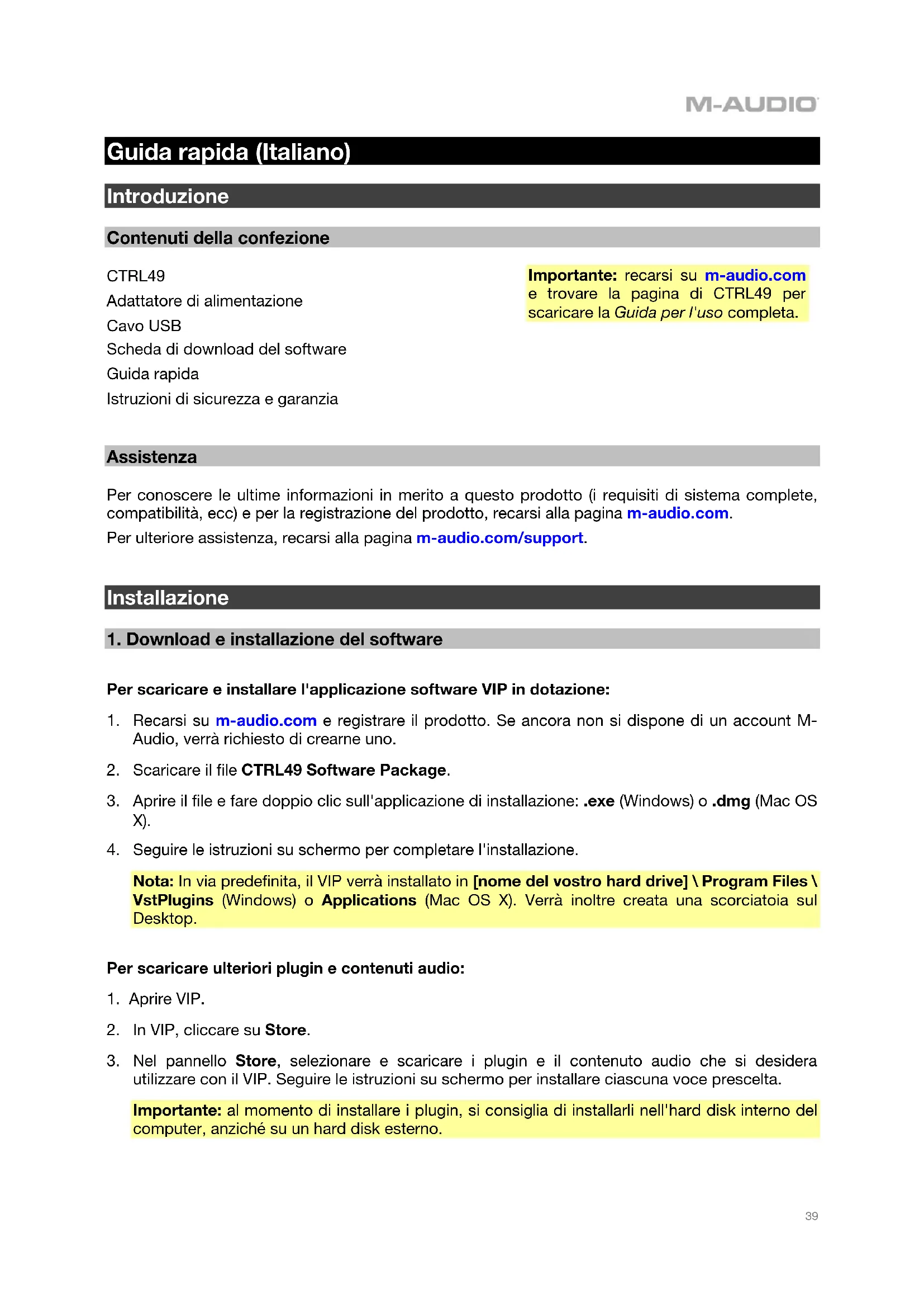 utilizzare con il VIP. Seguire le istruzioni su schermo per installare ciascuna voce prescelta. Importante: al momento di installare i plugin, si consiglia di installarli nell'hard disk interno del computer, anziché su un hard disk esterno. Importante: recarsi su m-audio.com e trovare la pagina di CTRL49 per scaricare la Guida per l'uso completa.40