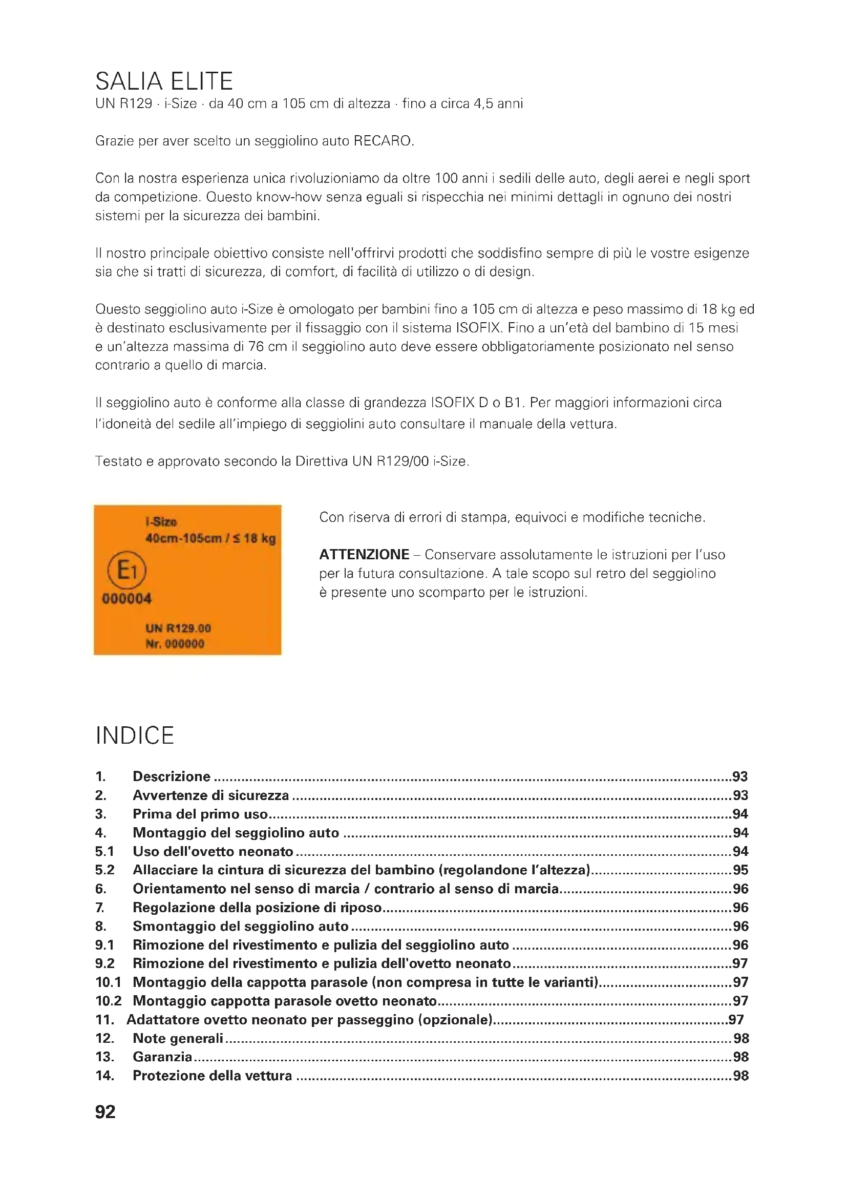 - Vēlamies norādīt, ka bērnu sēdekļa lietošana var bojāt automašīnas sēdekli. Drošības noteikumi EEK R129.00 paredz, ka bērnu sēdeklim ir jābūt stingri uzstādītam. Izmantojiet automašīnas sēdeklim piemērotus aizsarglīdzekļus (piemēram, RECARO automašīnas sēdekļa paliktni “Car Seat Protector”). Uzņēmums RecaroKidss.r.l. vai tā izplatītāji neatbild par iespējamiem automašīnas sēdekļa bojājumiem.92 SALIA ELITE UN R129 · i-Size · da 40 cm a 105 cm di altezza · fino a circa 4,5 anni Grazie per aver scelto un seggiolinoauto RECARO. Con la nostra esperienza unica rivoluzioniamo da oltre 100 anni i sedili delle auto, degli aerei e negli sport da competizione. Questo know-how senza eguali si rispecchia nei minimi dettagli in ognuno dei nostri sistemi per la sicurezza dei bambini. Il nostro principale obiettivo consiste nell'offrirvi prodotti che soddisfino sempre di più le vostre esigenze sia che si tratti di sicurezza, di comfort, di facilità di utilizzo o di design. Questo seggiolino auto i-Size è omologato per bambini fino a 105 cm di altezza e peso massimo di 18 kg ed è destinato esclusivamente per il fissaggio con il sistema ISOFIX. Fino a un’età del bambino di 15 mesi e un’altezza massima di 76 cm il seggiolinoauto deve essere obbligatoriamente posizionato nel senso contrario a quello di marcia. Il seggiolinoauto è conforme alla classe di grandezza ISOFIX D o B1. Per maggiori informazioni circa l‘idoneità del sedile all’impiego di seggiolini auto consultare il manuale della vettura. Testato e approvato secondo la Direttiva UN R129/00 i-Size. Con riserva di errori di stampa, equivoci e modifiche tecniche. ATTENZIONE – Conservare assolutamente le istruzioni per l’uso per la futura consultazione. A tale scopo sul retro del seggiolino èpresente uno scomparto per le istruzioni. INDICE 1. Descrizione p. 93