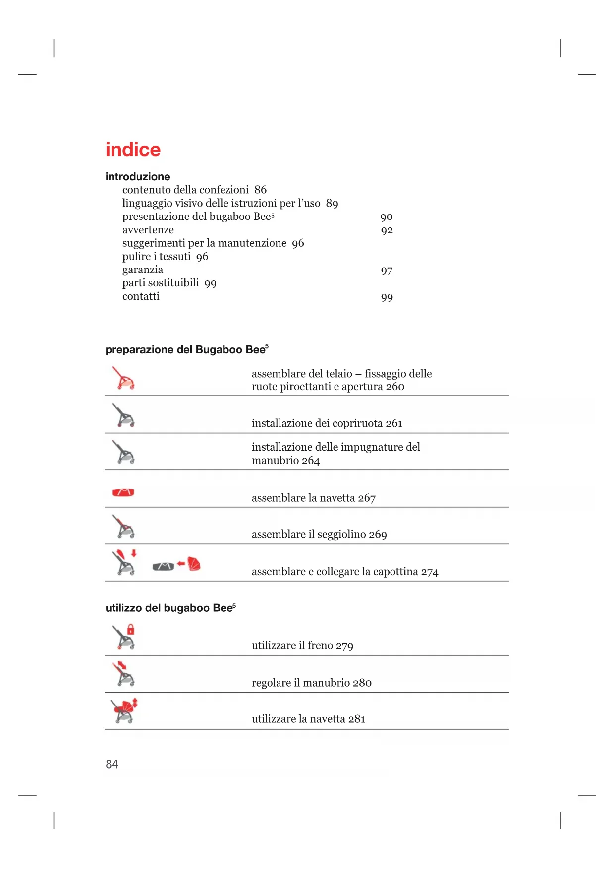 assemblare del telaio – fissaggio delle ruote piroettanti e apertura 260 installazione dei copriruota 261 installazione delle impugnature del manubrio 264 assemblare la navetta 267 assemblare il seggiolino 269 assemblare e collegare la capottina 274 utilizzo del bugaboo Bee