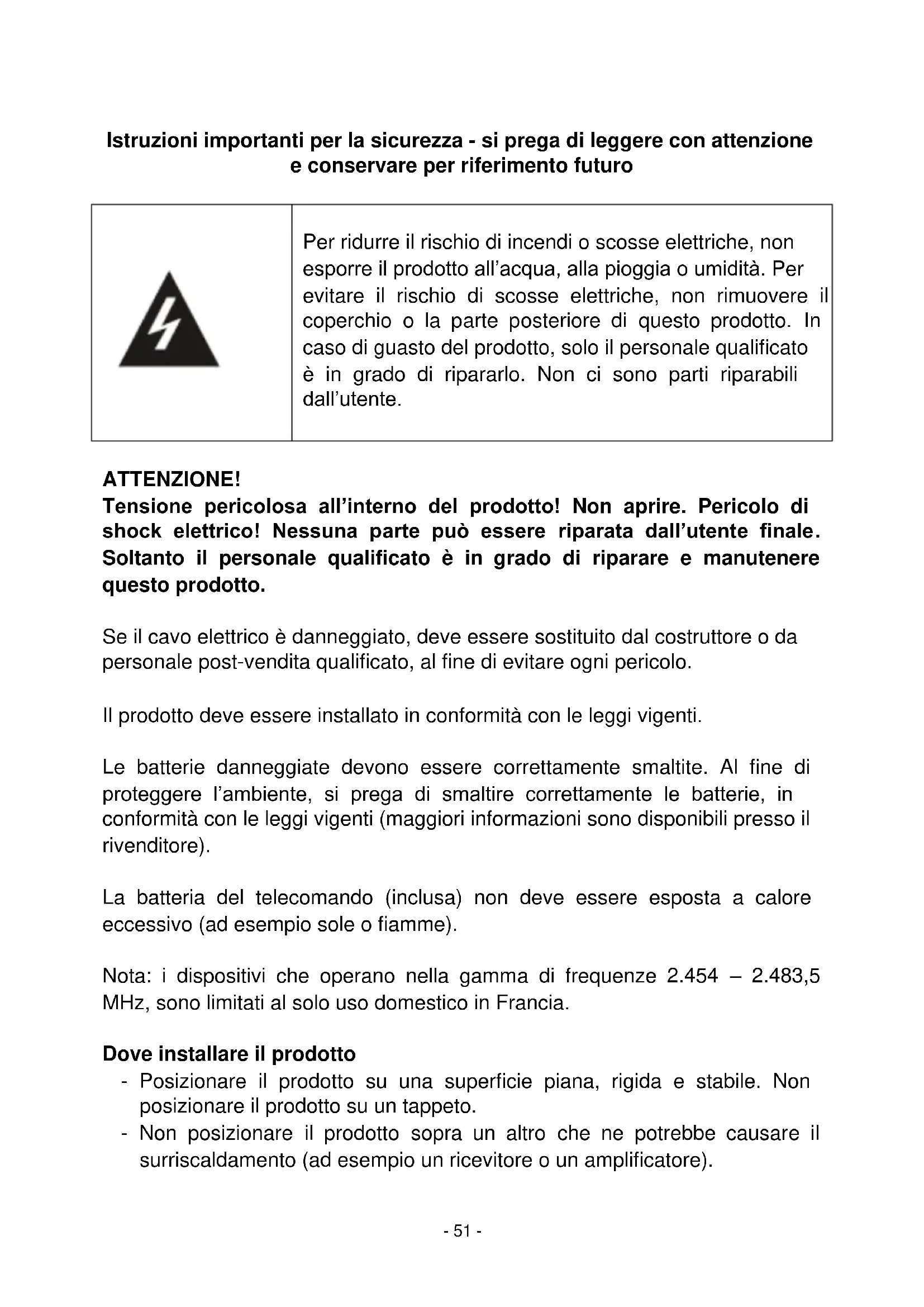 Per ridurre il rischio di incendi o scosse elettriche, non esporre il prodotto all’acqua, alla pioggia o umidità. Per evitare il rischio di scosse elettriche, non rimuovere il coperchio o la parte posteriore di questo prodotto. In caso di guasto del prodotto, solo il personale qualificato è in grado di ripararlo. Non ci sono parti riparabili dall’utente.