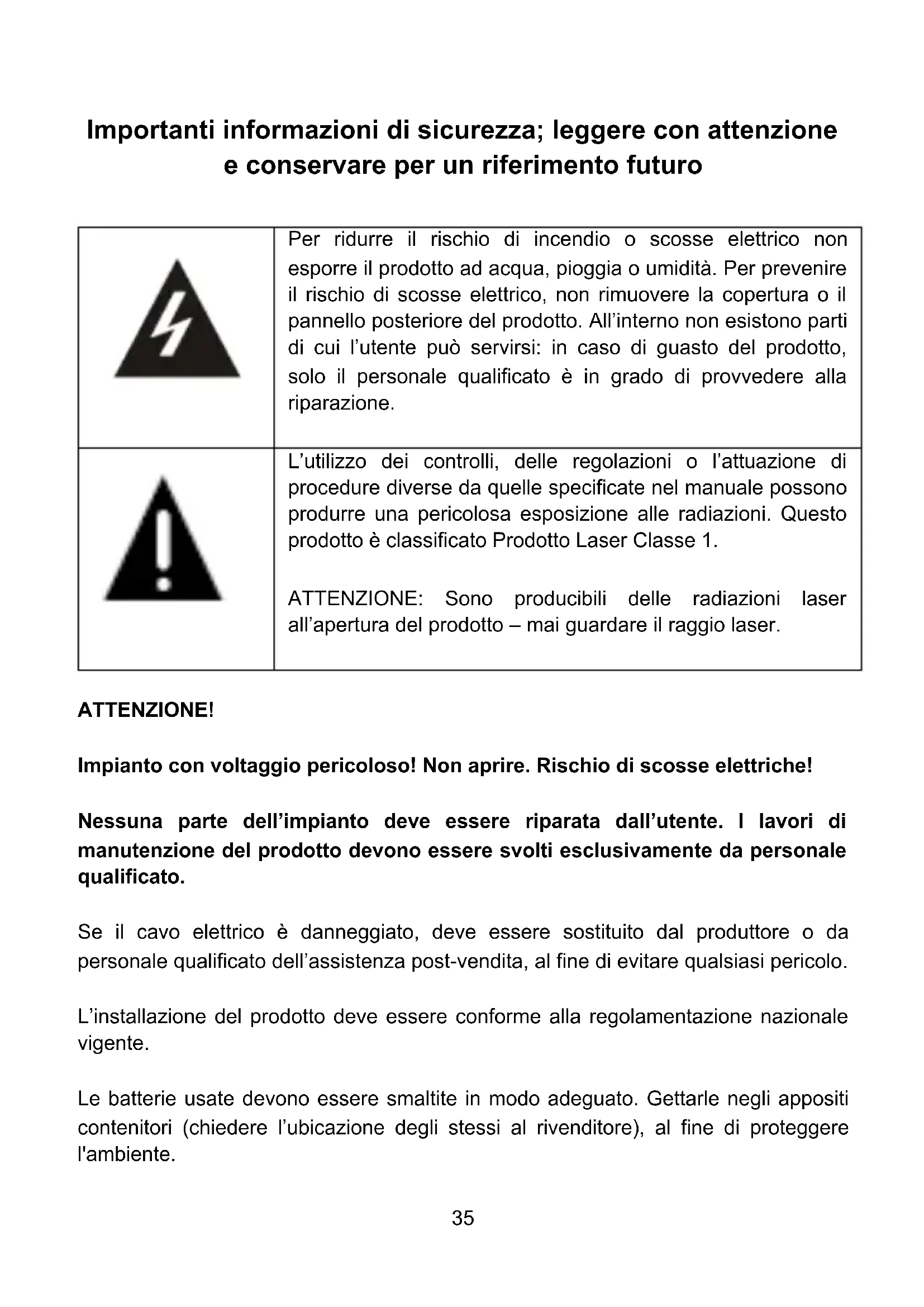 Per ridurre il rischio di incendio o scosse elettrico non esporre il prodotto ad acqua, pioggia o umidità. Per prevenire il rischio di scosse elettrico, non rimuovere la copertura o il pannello posteriore del prodotto. All’interno non esistono parti di cui l’utente può servirsi: in caso di guasto del prodotto, solo il personale qualificato è in grado di provvedere alla riparazione. L’utilizzo dei controlli, delle regolazioni o l’attuazione di procedure diverse da quelle specificate nel manuale possono produrre una pericolosa esposizione alle radiazioni. Questo prodotto è classificato Prodotto Laser Classe 1. ATTENZIONE: Sono producibili delle radiazioni laser all’apertura del prodotto – mai guardare il raggio laser. ATTENZIONE! Impianto con voltaggio pericoloso! Non aprire. Rischio di scosse elettriche! Nessuna parte dell’impianto deve essere riparata dall’utente. I lavori di manutenzione del prodotto devono essere svolti esclusivamente da personale qualificato. Se il cavo elettrico è danneggiato, deve essere sostituito dal produttore o da personale qualificato dell’assistenza post-vendita, al fine di evitare qualsiasi pericolo. L’installazione del prodotto deve essere conforme alla regolamentazione nazionale vigente. Le batterie usate devono essere smaltite in modo adeguato. Gettarle negli appositi contenitori (chiedere l’ubicazione degli stessi al rivenditore), al fine di proteggere l'ambiente.