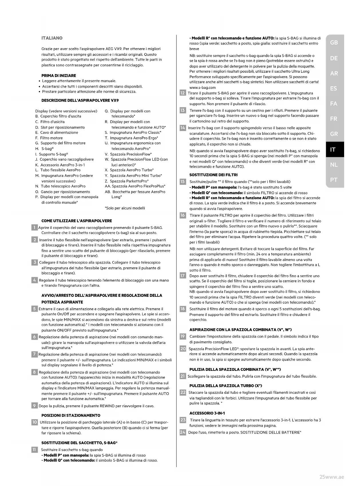 PT25www.aeg.com ITALIANO Grazie per aver scelto l'aspirapolvere AEG VX9. Per ottenere i migliori risultati, utilizzare sempre gli accessori e i ricambi originali. Questo prodotto è stato progettato nel rispetto dell'ambiente. Tutte le parti in plastica sono contrassegnate per consentirne il riciclaggio.