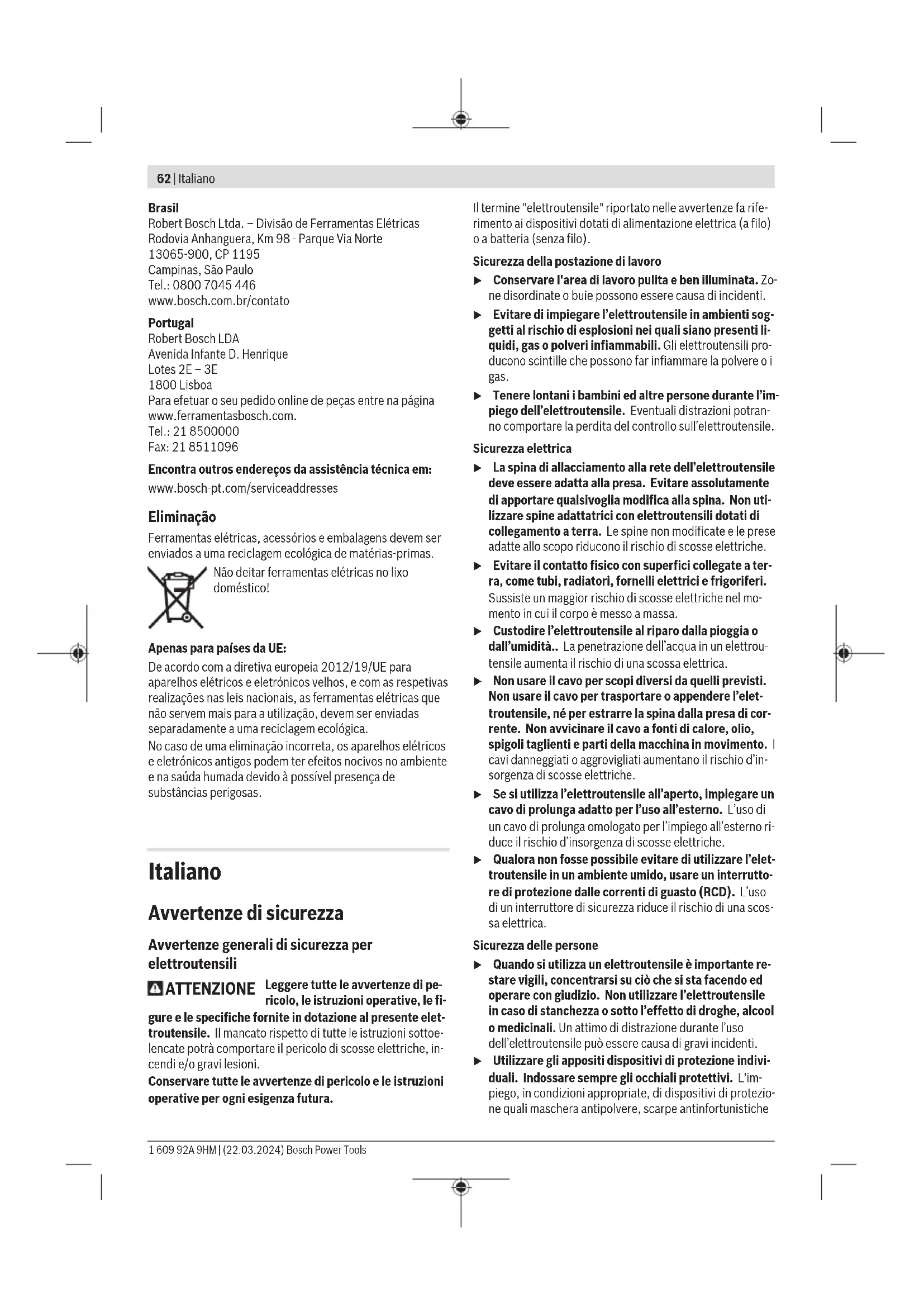 Versão do interruptor com sistema de retenção Para a colocação em funcionamento da ferramenta elétrica, pressione primeiro o interruptor de ligar/ desligar(2)➊, depois empurre-o para a frente ➋. Prima-o em seguida e mantenha-o premido ➌. Para fixar o interruptor de ligar/desligar(2) pressionado, desloque o interruptor de ligar/desligar(2) mais para a frente ➍. Para desligar a ferramenta elétrica, solte o interruptor de ligar/desligar(2) ou se este estiver bloqueado, pressione o interruptor de ligar/desligar(2) brevemente e depois liberte-o. Versão do interruptor sem sistema de retenção Para a colocação em funcionamento da ferramenta elétrica, pressione primeiro o interruptor de ligar/ desligar(2)➊, depois empurre-o para a frente ➋. Prima-o em seguida e mantenha-o premido ➌. Para desligar a ferramenta elétrica, liberte o interruptor de ligar/desligar(2). u Verifique as ferramentas de lixar antes da utilização. A ferramenta de lixar tem de estar corretamente montada e poder ser livremente rodada. Efetue um teste de funcionamento durante, pelo menos, 1 minuto, sem carga. Não utilize ferramentas de lixar danificadas, não redondas ou com vibrações. As ferramentas de lixar danificadas podem rebentar e causar ferimentos. Manutenção e assistência técnica Manutenção e limpeza u Antes de todos trabalhos na ferramenta elétrica deverá puxar a ficha de rede da tomada. u Manter a ferramenta elétrica e as aberturas de ventilação sempre limpas, para trabalhar bem e de forma segura. u Em condições de utilização extremas utilize sempre, se possível, um sistema de aspiração. Sopre frequentemente as aberturas de ventilação e interconecte um disjuntor de corrente de avaria (PRCD). Durante o processamento de metais é possível que se deposite pó condutivo no interior da ferramenta elétrica. Isto pode prejudicar o isolamento de proteção da ferramenta elétrica. Os acessórios devem ser armazenados e tratados com cuidado. Se for necessário instalar um cabo de ligação, a instalação deve ser feita pela Bosch ou por um centro de serviço autorizado para ferramentas elétricas Bosch, para evitar perigos de segurança. Serviço pós-venda e aconselhamento O serviço pós-venda responde às suas perguntas a respeito de serviços de reparação e de manutenção do seu produto, assim como das peças sobressalentes. Desenhos explodidos e informações acerca das peças sobressalentes também em: www.bosch-pt.com A nossa equipa de consultores Bosch esclarece com prazer todas as suas dúvidas a respeito dos nossos produtos e acessórios. Indique para todas as questões e encomendas de peças sobressalentes a referência de 10 dígitos de acordo com a placa de caraterísticas do produto. Bosch Power Tools 1 609 92A 9HM | (22.03.2024)62 | Italiano Brasil Robert Bosch Ltda. – Divisão de Ferramentas Elétricas Rodovia Anhanguera, Km 98 - Parque Via Norte 13065-900, CP 1195 Campinas, São Paulo Tel.: 0800 7045 446 www.bosch.com.br/contato Portugal Robert Bosch LDA Avenida Infante D. Henrique Lotes 2E – 3E 1800 Lisboa Para efetuar o seu pedido online de peças entre na página www.ferramentasbosch.com. Tel.: 21 8500000 Fax: 21 8511096 Encontra outros endereços da assistência técnica em: www.bosch-pt.com/serviceaddresses Eliminação Ferramentas elétricas, acessórios e embalagens devem ser enviados a uma reciclagem ecológica de matérias-primas. Não deitar ferramentas elétricas no lixo doméstico! Apenas para países da UE: De acordo com a diretiva europeia 2012/19/UE para aparelhos elétricos e eletrónicos velhos, e com as respetivas realizações nas leis nacionais, as ferramentas elétricas que não servem mais para a utilização, devem ser enviadas separadamente a uma reciclagem ecológica. No caso de uma eliminação incorreta, os aparelhos elétricos e eletrónicos antigos podem ter efeitos nocivos no ambiente e na saúda humada devido à possível presença de substâncias perigosas. Italiano Avvertenze di sicurezza Avvertenze generali di sicurezza per elettroutensili ATTENZIONE Leggere tutte le avvertenze di pe- ricolo, le istruzioni operative, le fi- gure e le specifiche fornite in dotazione al presente elet- troutensile. Il mancato rispetto di tutte le istruzioni sottoe- lencate potrà comportare il pericolo di scosse elettriche, in- cendi e/o gravi lesioni. Conservare tutte le avvertenze di pericolo e le istruzioni operative per ogni esigenza futura. Il termine "elettroutensile" riportato nelle avvertenze fa rife- rimento ai dispositivi dotati di alimentazione elettrica (a filo) o a batteria (senza filo). Sicurezza della postazione di lavoro u Conservare l'area di lavoro pulita e ben illuminata. Zo- ne disordinate o buie possono essere causa di incidenti. u Evitare di impiegare l’elettroutensile in ambienti sog- getti al rischio di esplosioni nei quali siano presenti li- quidi, gas o polveri infiammabili. Gli elettroutensili pro- ducono scintille che possono far infiammare la polvere o i gas. u Tenere lontani i bambini ed altre persone durante l’im- piego dell’elettroutensile. Eventuali distrazioni potran- no comportare la perdita del controllo sull’elettroutensile. Sicurezza elettrica u La spina di allacciamento alla rete dell’elettroutensile deve essere adatta alla presa. Evitare assolutamente di apportare qualsivoglia modifica alla spina. Non uti- lizzare spine adattatrici con elettroutensili dotati di collegamento a terra. Le spine non modificate e le prese adatte allo scopo riducono il rischio di scosse elettriche. u Evitare il contatto fisico con superfici collegate a ter- ra, come tubi, radiatori, fornelli elettrici e frigoriferi. Sussiste un maggior rischio di scosse elettriche nel mo- mento in cui il corpo è messo a massa. u Custodire l’elettroutensile al riparo dalla pioggia o dall’umidità.. La penetrazione dell’acqua in un elettrou- tensile aumenta il rischio di una scossa elettrica. u Non usare il cavo per sco