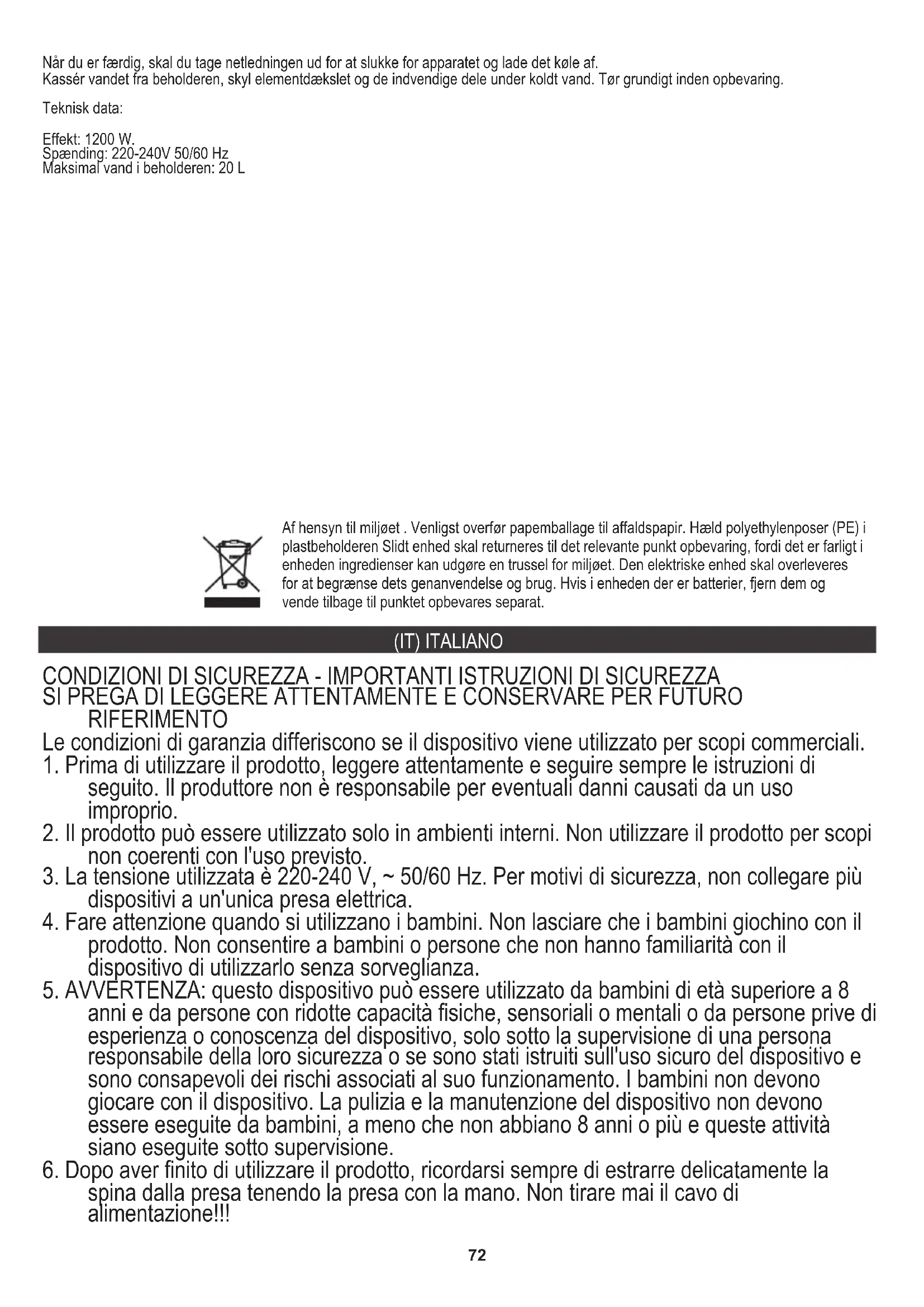 spina dalla presa tenendo la presa con la mano. Non tirare mai il cavo di alimentazione!!! Når du er færdig, skal du tage netledningen ud for at slukke for apparatet og lade det køle af. Kassér vandet fra beholderen, skyl elementdækslet og de indvendige dele under koldt vand. Tør grundigt inden opbevaring. Teknisk data: Effekt: 1200 W. Spænding: 220-240V 50/60 Hz Maksimal vand i beholderen: 20 L73