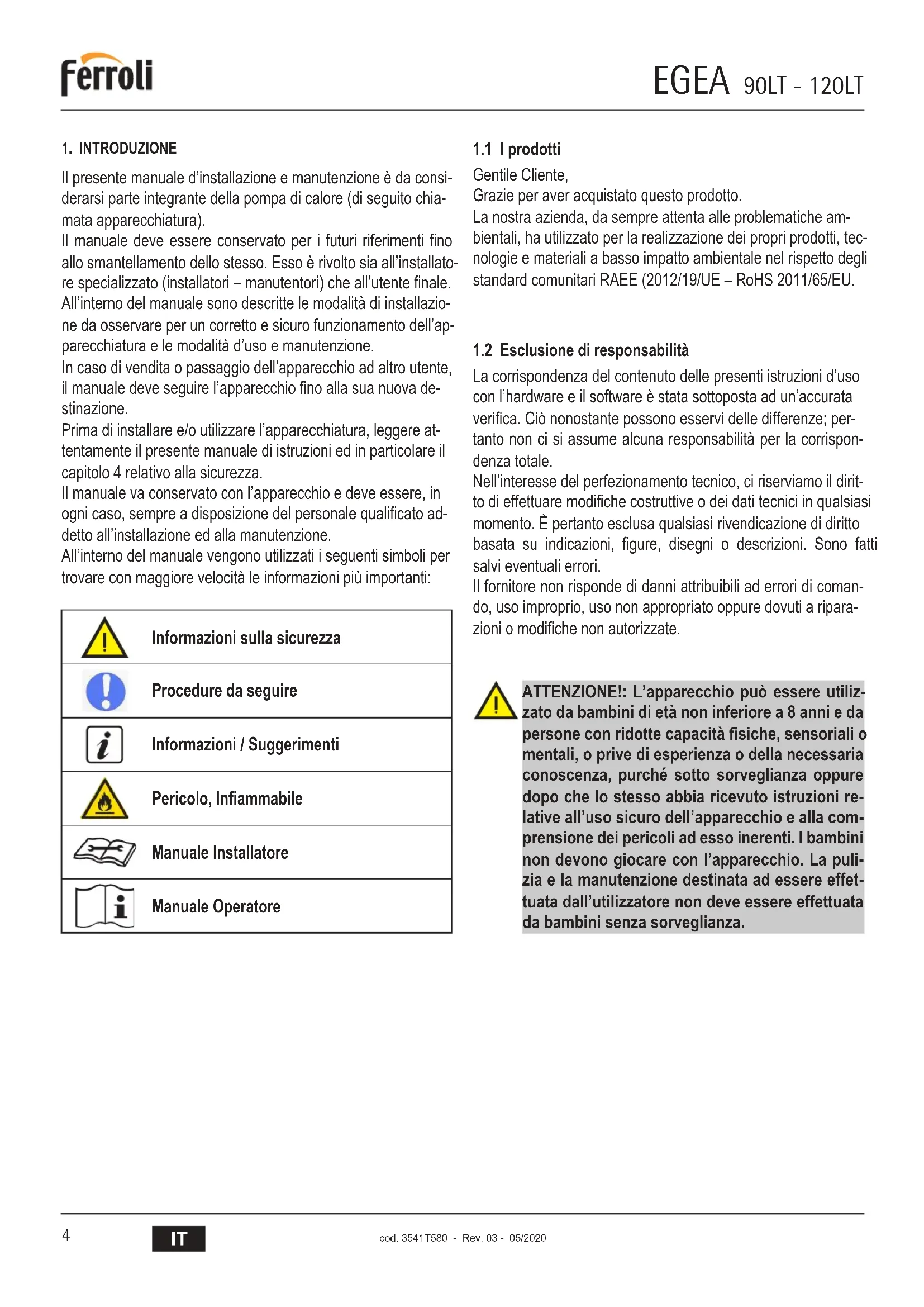 1. INTRODUZIONEIl presente manuale d’installazione e manutenzione è da consi-derarsi parte integrante della pompa di calore (di seguito chia-mata apparecchiatura).Il manuale deve essere conservato per i futuri riferimenti fino allo smantellamento dello stesso. Esso è rivolto sia all’installato-re specializzato (installatori – manutentori) che all’utente finale. All’interno del manuale sono descritte le modalità di installazio-ne da osservare per un corretto e sicuro funzionamento dell’ap-parecchiatura e le modalità d’uso e manutenzione.In caso di vendita o passaggio dell’apparecchio ad altro utente, il manuale deve seguire l’apparecchio fino alla sua nuova de-stinazione.Prima di installare e/o utilizzare l’apparecchiatura, leggere at-tentamente il presente manuale di istruzioni ed in particolare il capitolo 4 relativo alla sicurezza. Il manuale va conservato con l’apparecchio e deve essere, in ogni caso, sempre a disposizione del personale qualificato ad-detto all’installazione ed alla manutenzione. All’interno del manuale vengono utilizzati i seguenti simboli per trovare con maggiore velocità le informazioni più importanti: Informazioni sulla sicurezza Procedure da seguire Informazioni / Suggerimenti Pericolo, Infiammabile Manuale Installatore Manuale Operatore 1.1 I prodotti Gentile Cliente, Grazie per aver acquistato questo prodotto.La nostra azienda, da sempre attenta alle problematiche am-bientali, ha utilizzato per la realizzazione dei propri prodotti, tec-nologie e materiali a basso impatto ambientale nel rispetto degli standard comunitari RAEE (2012/19/UE – RoHS 2011/65/EU.1.2 Esclusione di responsabilitàLa corrispondenza del contenuto delle presenti istruzioni d’uso con l’hardware e il software è stata sottoposta ad un’accurata verifica. Ciò nonostante possono esservi delle differenze; per-tanto non ci si assume alcuna responsabilità per la corrispon-denza totale.Nell’interesse del perfezionamento tecnico, ci riserviamo il dirit-to di effettuare modifiche costruttive o dei dati tecnici in qualsiasi momento. È pertanto esclusa qualsiasi rivendicazione di diritto basata su indicazioni, figure, disegni o descrizioni. Sono fatti salvi eventuali errori.Il fornitore non risponde di danni attribuibili ad errori di coman-do, uso improprio, uso non appropriato oppure dovuti a ripara-zioni o modifiche non autorizzate. ATTENZIONE!: L’apparecchio può essere utiliz-zato da bambini di età non inferiore a 8 anni e da persone con ridotte capacità siche, sensoriali o mentali, o prive di esperienza o della necessaria conoscenza, purché sotto sorveglianza oppure dopo che lo stesso abbia ricevuto istruzioni re-lative all’uso sicuro dell’apparecchio e alla com-prensione dei pericoli ad esso inerenti. I bambini non devono giocare con l’apparecchio. La puli-zia e la manutenzione destinata ad essere effet-tuata dall’utilizzatore non deve essere effettuata da bambini senza sorveglianza.EGEA 90LT - 120LT