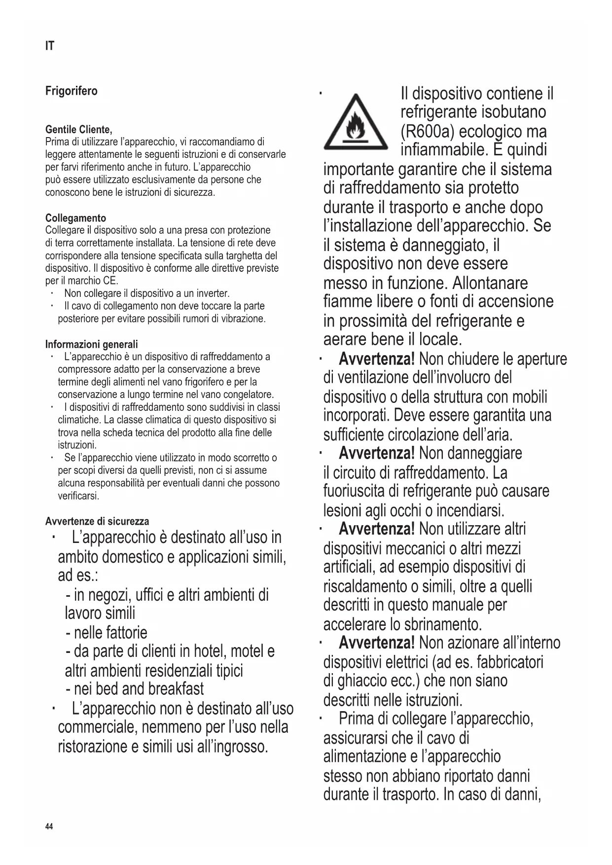Il dispositivo contiene il refrigerante isobutano (R600a) ecologico ma inammabile. È quindi importante garantire che il sistema di raffreddamento sia protetto durante il trasporto e anche dopo l’installazione dell’apparecchio. Se il sistema è danneggiato, il dispositivo non deve essere messo in funzione. Allontanare amme libere o fonti di accensione in prossimità del refrigerante e aerare bene il locale. ∙ Avvertenza! Non chiudere le aperture di ventilazione dell’involucro del dispositivo o della struttura con mobili incorporati. Deve essere garantita una sufciente circolazione dell’aria. ∙ Avvertenza! Non danneggiare il circuito di raffreddamento. La fuoriuscita di refrigerante può causare lesioni agli occhi o incendiarsi. ∙ Avvertenza! Non utilizzare altri dispositivi meccanici o altri mezzi articiali, ad esempio dispositivi di riscaldamento o simili, oltre a quelli descritti in questo manuale per accelerare lo sbrinamento. ∙ Avvertenza! Non azionare all’interno dispositivi elettrici (ad es. fabbricatori di ghiaccio ecc.) che non siano descritti nelle istruzioni. ∙ Prima di collegare l’apparecchio, assicurarsi che il cavo di alimentazione e l’apparecchio stesso non abbiano riportato danni durante il trasporto. In caso di danni, IT45 142 x 208 mm l’apparecchio non può essere messo in servizio. ∙ Durante la congurazione del dispositivo, assicurarsi che il cavo di alimentazione non venga schiacciato o danneggiato. ∙ Non posizionare prese multiple portatili o alimentatori sul retro del dispositivo. ∙ Non conservare sostanze esplosive in questo dispositivo, come contenitori per aerosol con propellenti inammabili. ∙ In fase di vendita, conferimento o conferimento al riciclaggio, si deve fare riferimento al propellente ciclopentano presente nell’isolante e al refrigerante R600a. Per ulteriori informazioni sul riciclaggio professionale, fare riferimento alla sezione “Smaltimento”. ∙ Se sono necessarie riparazioni o interventi sull’apparecchio, questi devono essere eseguiti da un servizio clienti autorizzato al ne di rispettare le norme di sicurezza ed evitare pericoli. Questo vale anche per la sostituzione del cavo di collegamento. ∙ L’apparecchio può essere utilizzato da bambini a partire dall’età di 8 anni e da persone con ridotte capacità siche, sensoriali o mentali o prive di esperienza e/o conoscenza se sono supervisionati o sono stati istruiti sull’uso sicuro del dispositivo e hanno compreso i pericoli che ne derivano. ∙ I bambini dai 3 anni di età e di età inferiore agli 8 anni possono caricare e scaricare il frigorifero/congelatore. ∙ I bambini non devono giocare con l’apparecchio. ∙ La pulizia e la manutenzione da parte dell’utente non devono essere eseguite da bambini senza supervisione. ∙ Per una manutenzione regolare, basta usare acqua tiepida con l’aggiunta di detersivo. Per informazioni più dettagliate, consultare la sezione Pulizia e sbrinamento. ∙ Per informazioni sulla sostituzione del LED, fare riferimento alla sezione sull’Illuminazione interna. Per evitare di contaminare gli alimenti, seguire le istruzioni seguenti: ∙ Se la porta viene aperta per un lungo periodo, la temperatura nei vani dell’apparecchio può aumentare notevolmente. ∙ Le superci a contatto con gli alimenti e i sistemi di scarico accessibili devono essere pulite regolarmente. ∙ Conservare carne e pesce crudi in appositi contenitori in frigorifero in modo che non tocchino o gocciolino su altri alimenti. ∙ Se il frigorifero/congelatore viene lasciato vuoto per lungo tempo, spegnere l’apparecchio, sbrinarlo, pulirlo e lasciare la porta aperta per evitare la formazione di muffa.46 142 x 208 mm Conservazione degli alimenti ∙ Nella cella frigorifera vengono create diverse zone fredde. La zona più calda è sulla porta nella parte superiore del frigorifero. La zona più fredda si trova sulla parete di fondo in fondo al vano frigorifero. ∙ Pertanto classicare il cibo come segue: ∙ Sui ripiani del vano frigorifero (dall’alto verso il basso): Prodotti da forno, piatti pronti, latticini, carne, pesce e salsicce. ∙ Nel cassetto delle verdure: Verdure, insalate e frutta. ∙ Nella porta (dall’alto verso il basso): Burro, formaggio, uova, tubetti, bottiglie piccole, bottiglie grandi, latte e sacchetti di succo. ∙ Per evitare lesioni personali e danni alle cose, trasportare l’apparecchio solo quando è imballato e installato da due persone. ∙ Attenzione! Tenere i bambini lontani dal materiale di imballaggio. Sussiste, tra l’altro il rischio di soffocamento! ∙ Non ingerire il ghiaccio rimosso dal dispositivo. ∙ Controllare regolarmente che il cavo di collegamento non sia danneggiato. In caso di danneggiamento, l’apparecchio non deve più essere utilizzato. ∙ Per evitare il rischio di incendio, non azionare alcun dispositivo elettrico nell’area di parcheggio. Inoltre, non posizionare contenitori di liquidi sul dispositivo, in modo che eventuali perdite di liquidi non compromettano l’isolamento elettrico. ∙ L’apparecchio viene utilizzato solo per conservare il cibo. ∙ Conservare l’alcol ad alta percentuale ben chiuso e in posizione verticale. ∙ Non conservare bottiglie di vetro con liquidi congelabili o liquidi gassati nell’apparecchio, poiché potrebbero scoppiare durante il congelamento. ∙ Non consumare cibi conservati. Possono portare ad intossicazione alimentare. Non ricongelare alimenti già scongelati. ∙ Non abusare di ripiani, vani, ante, ecc. come gradini o supporti. ∙ Non maneggiare amme libere o fonti di accensione all’interno del dispositivo. ∙ Estrarre la spina di alimentazione, - in caso di malfunzionamenti durante il funzionamento, - prima di sbrinare il dispositivo, - prima di ogni pulizia, - quando si lavora sull’apparecchio. ∙ Non estrarre la spina dalla presa tramite il cavo di collegamento; afferrare la spina di alimentazione. ∙ Ci riserviamo il diritto di 