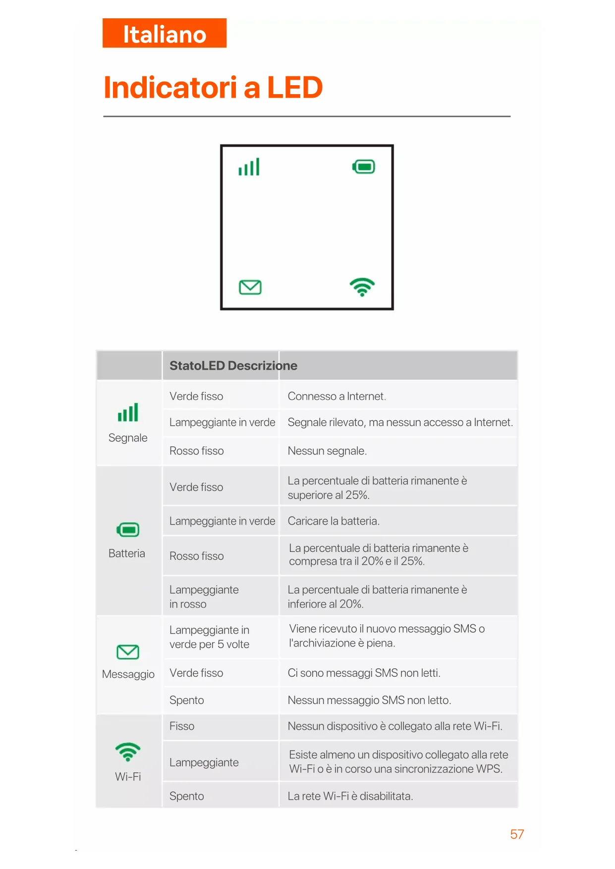 Indicatori a LED StatoLED Descrizione Verde fisso Lampeggiante in verde Rosso fisso Connesso a Internet. Segnale rilevato, ma nessun accesso a Internet. Nessun segnale. Verde fisso Lampeggiante in verde Rosso fisso La percentuale di batteria rimanente è superiore al 25%. Caricare la batteria. Lampeggiante in verde per 5 volte Verde fisso Spento Ci sono messaggi SMS non letti. Nessun messaggio SMS non letto. Fisso Lampeggiante Spento Nessun dispositivo è collegato alla rete Wi-Fi. La rete Wi-Fi è disabilitata. Lampeggiante in rosso La percentuale di batteria rimanente è inferiore al 20%. Segnale Batteria Messaggio Wi-Fi La percentuale di batteria rimanente è compresa tra il 20% e il 25%. Viene ricevuto il nuovo messaggio SMS o l'archiviazione è piena. Esiste almeno un dispositivo collegato alla rete Wi-Fi o è in corso una sincronizzazione WPS.Italiano