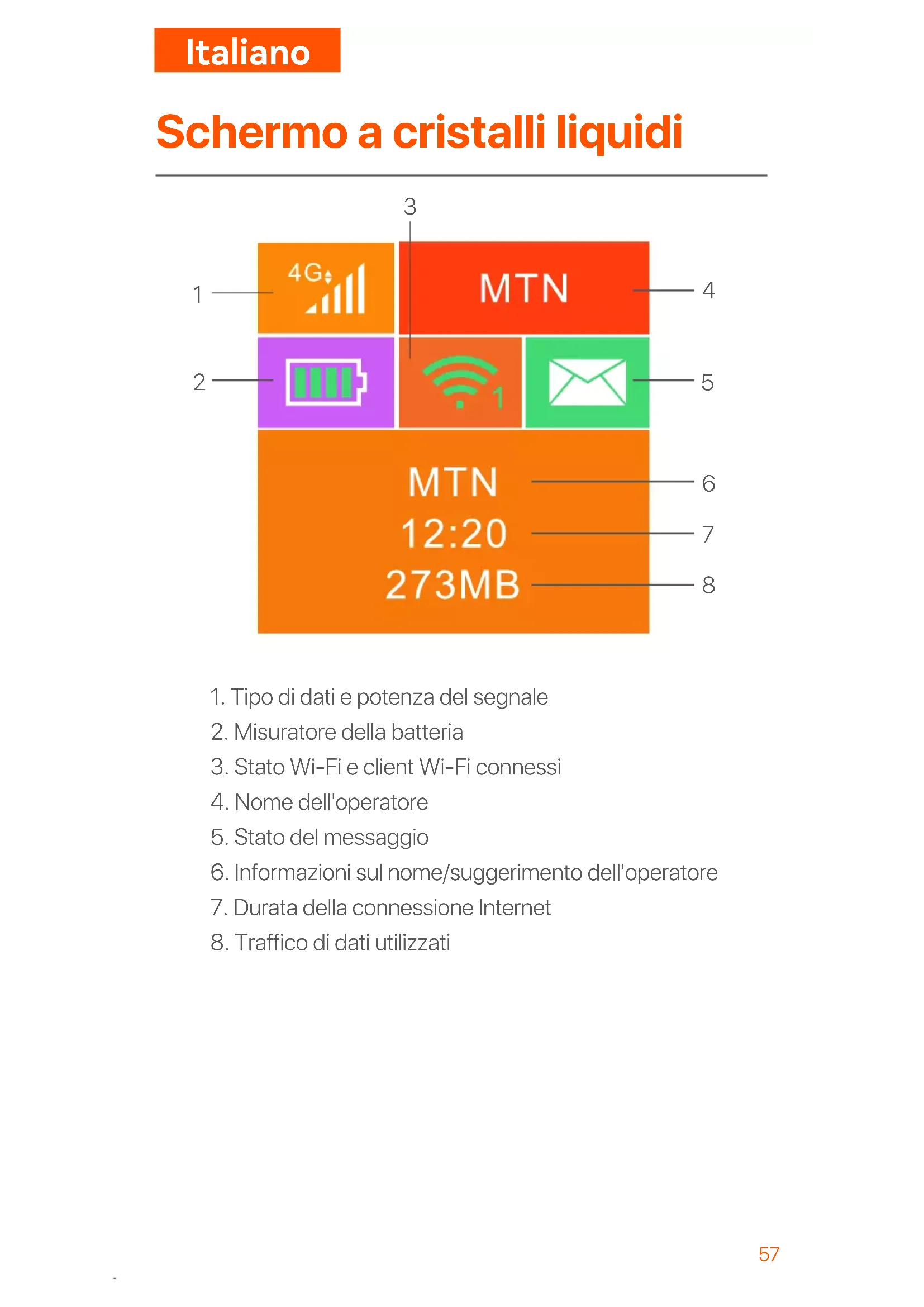 Accendere il dispositivo Tipo di dati e potenza del segnale Tenere premuto il pulsante finché lo schermo LCD si accende. Quando il dispositivo è connesso a Internet, verrà evidenziato: Se l'hotspot non è connesso a Internet dopo molto tempo, fate riferimento alla sezione Q1 nelle FAQ. SuggerimentiItaliano