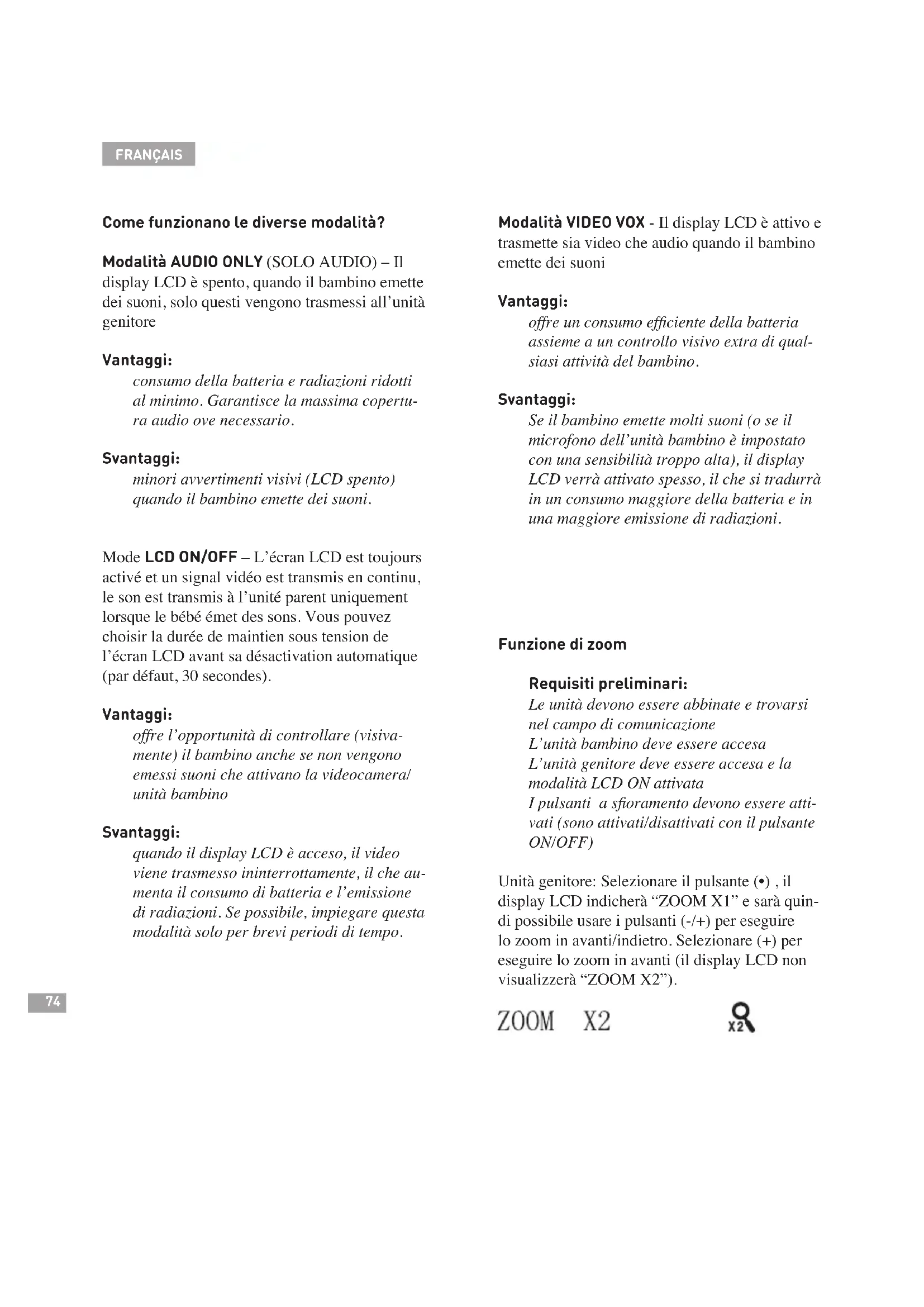 FRANÇAIS Come funzionano le diverse modalità? Modalità AUDIO ONLY (SOLO AUDIO) – Il display LCD è spento, quando il bambino emette dei suoni, solo questi vengono trasmessi all’unità genitore Vantaggi: consumo della batteria e radiazioni ridotti al minimo. Garantisce la massima copertu- ra audio ove necessario. Svantaggi: minori avvertimenti visivi (LCD spento) quando il bambino emette dei suoni. Mode LCD ON/OFF – L’écran LCD est toujours activé et un signal vidéo est transmis en continu, le son est transmis à l’unité parent uniquement lorsque le bébé émet des sons. Vous pouvez choisir la durée de maintien sous tension de l’écran LCD avant sa désactivation automatique (par défaut, 30 secondes). Vantaggi: offre l’opportunità di controllare (visiva- mente) il bambino anche se non vengono emessi suoni che attivano la videocamera/ unità bambino Svantaggi: quando il display LCD è acceso, il video viene trasmesso ininterrottamente, il che au- menta il consumo di batteria e l’emissione di radiazioni. Se possibile, impiegare questa modalità solo per brevi periodi di tempo. Modalità VIDEO VOX - Il display LCD è attivo e trasmette sia video che audio quando il bambino emette dei suoni Vantaggi: offre un consumo efciente della batteria assieme a un controllo visivo extra di qual- siasi attività del bambino. Svantaggi: Se il bambino emette molti suoni (o se il microfono dell’unità bambino è impostato con una sensibilità troppo alta), il display LCD verrà attivato spesso, il che si tradurrà in un consumo maggiore della batteria e in una maggiore emissione di radiazioni. Funzione di zoom Requisiti preliminari: Le unità devono essere abbinate e trovarsi nel campo di comunicazione L’unità bambino deve essere accesa L’unità genitore deve essere accesa e la modalità LCD ON attivata I pulsanti a soramento devono essere atti- vati (sono attivati/disattivati con il pulsante ON/OFF) Unità genitore: Selezionare il pulsante (•) , il display LCD indicherà “ZOOM X1” e sarà quin- di possibile usare i pulsanti (-/+) per eseguire lo zoom in avanti/indietro. Selezionare (+) per eseguire lo zoom in avanti (il display LCD non visualizzerà “ZOOM X2”).75 Regolazione della sensibilità del microfono delle unità bambino Requisiti preliminari: L’unità genitore deve essere accesa I pulsanti a soramento devono essere atti- vati (sono attivati/disattivati con il pulsante ON/OFF) Unità genitore: Tenere premuto il pulsante (•) per 2 secondi per accedere al menu. Unità genitore: Usare i pulsanti (-/+) per selezionare BABY SETTINGS (IM- POSTAZIONI BAMBINO) nel menu. Confermare la scelta selezionando il pulsante (•). Selezionare ora MIC SENS (SENSIBILITÀ MICROFONO) e confer- mare la scelta selezionando (•). Usare ora i pulsanti (-/+) per regolare la sensibilità del microfono. Confermare la scelta selezionan- do il pulsante (•) Se si desidera modicare la sensibilità del microfono su un’unità bambino diversa, sarà necessario modicare il numero a destra di BABY (riportato come BABY 1 nell’immagine sottostante).