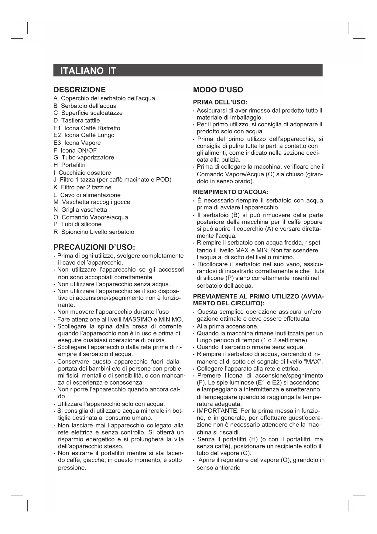 - Não se recomendam soluções caseiras, tal como o uso de vinagre, nos tratamentos de descalcicação do aparelho. PTITALIANO IT DESCRIZIONE A Coperchio del serbatoio dell’acqua B Serbatoio dell’acqua C Supercie scaldatazze D Tastiera tattile E1 Icona Caffè Ristretto E2 Icona Caffè Lungo E3 Icona Vapore F Icona ON/OF G Tubo vaporizzatore H Portaltri I Cucchiaio dosatore J Filtro 1 tazza (per caffè macinato e POD) K Filtro per 2 tazzine L Cavo di alimentazione M Vaschetta raccogli gocce N Griglia vaschetta O Comando Vapore/acqua P Tubi di silicone R Spioncino Livello serbatoio PRECAUZIONI D’USO: