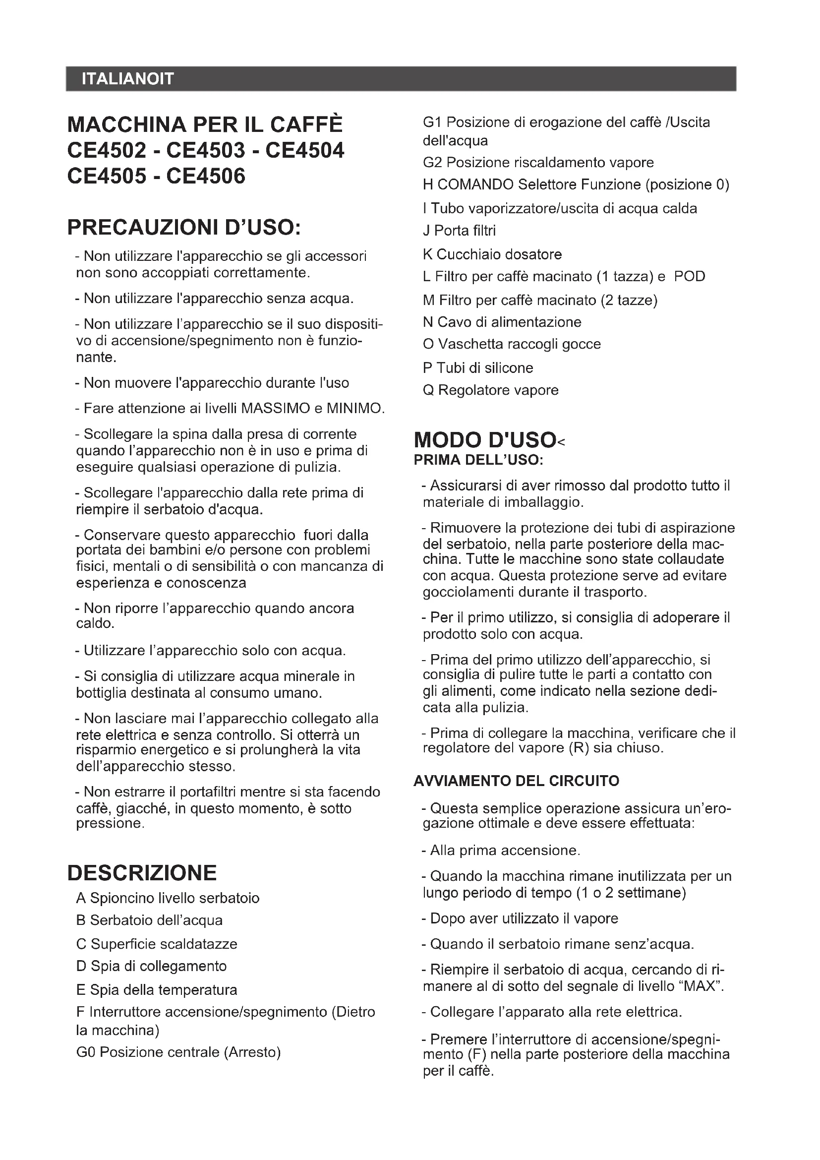 CE4502 - CE4503 - CE4504 CE4505 - CE4506 PRECAUZIONI D’USO: - Non utilizzare l'apparecchio se gli accessori non sono accoppiati correttamente. - Non utilizzare l'apparecchio senza acqua. - Non utilizzare l’apparecchio se il suo dispositi- vo di accensione/spegnimento non è funzio- nante. - Non muovere l'apparecchio durante l'uso - Fare attenzione ai livelli MASSIMO e MINIMO. - Scollegare la spina dalla presa di corrente quando l’apparecchio non è in uso e prima di eseguire qualsiasi operazione di pulizia. - Scollegare l'apparecchio dalla rete prima di riempire il serbatoio d'acqua. - Conservare questo apparecchio fuori dalla portata dei bambini e/o persone con problemi sici, mentali o di sensibilità o con mancanza di esperienza e conoscenza - Non riporre l’apparecchio quando ancora caldo. - Utilizzare l’apparecchio solo con acqua. - Si consiglia di utilizzare acqua minerale in bottiglia destinata al consumo umano. - Non lasciare mai l’apparecchio collegato alla rete elettrica e senza controllo. Si otterrà un risparmio energetico e si prolungherà la vita dell’apparecchio stesso. - Non estrarre il portaltri mentre si sta facendo caffè, giacché, in questo momento, è sotto pressione. DESCRIZIONE A Spioncino livello serbatoio B Serbatoio dell’acqua C Supercie scaldatazze D Spia di collegamento E Spia della temperatura F Interruttore accensione/spegnimento (Dietro la macchina) G0 Posizione centrale (Arresto) G1 Posizione di erogazione del caffè /Uscita dell'acqua G2 Posizione riscaldamento vapore H COMANDO Selettore Funzione (posizione 0) I Tubo vaporizzatore/uscita di acqua calda J Porta ltri K Cucchiaio dosatore L Filtro per caffè macinato (1 tazza) e POD M Filtro per caffè macinato (2 tazze) N Cavo di alimentazione O Vaschetta raccogli gocce P Tubi di silicone Q Regolatore vapore MODO D'USO< PRIMA DELL’USO: - Assicurarsi di aver rimosso dal prodotto tutto il materiale di imballaggio. - Rimuovere la protezione dei tubi di aspirazione del serbatoio, nella parte posteriore della mac- china. Tutte le macchine sono state collaudate con acqua. Questa protezione serve ad evitare gocciolamenti durante il trasporto. - Per il primo utilizzo, si consiglia di adoperare il prodotto solo con acqua. - Prima del primo utilizzo dell’apparecchio, si consiglia di pulire tutte le parti a contatto con gli alimenti, come indicato nella sezione dedi- cata alla pulizia. - Prima di collegare la macchina, vericare che il regolatore del vapore (R) sia chiuso.