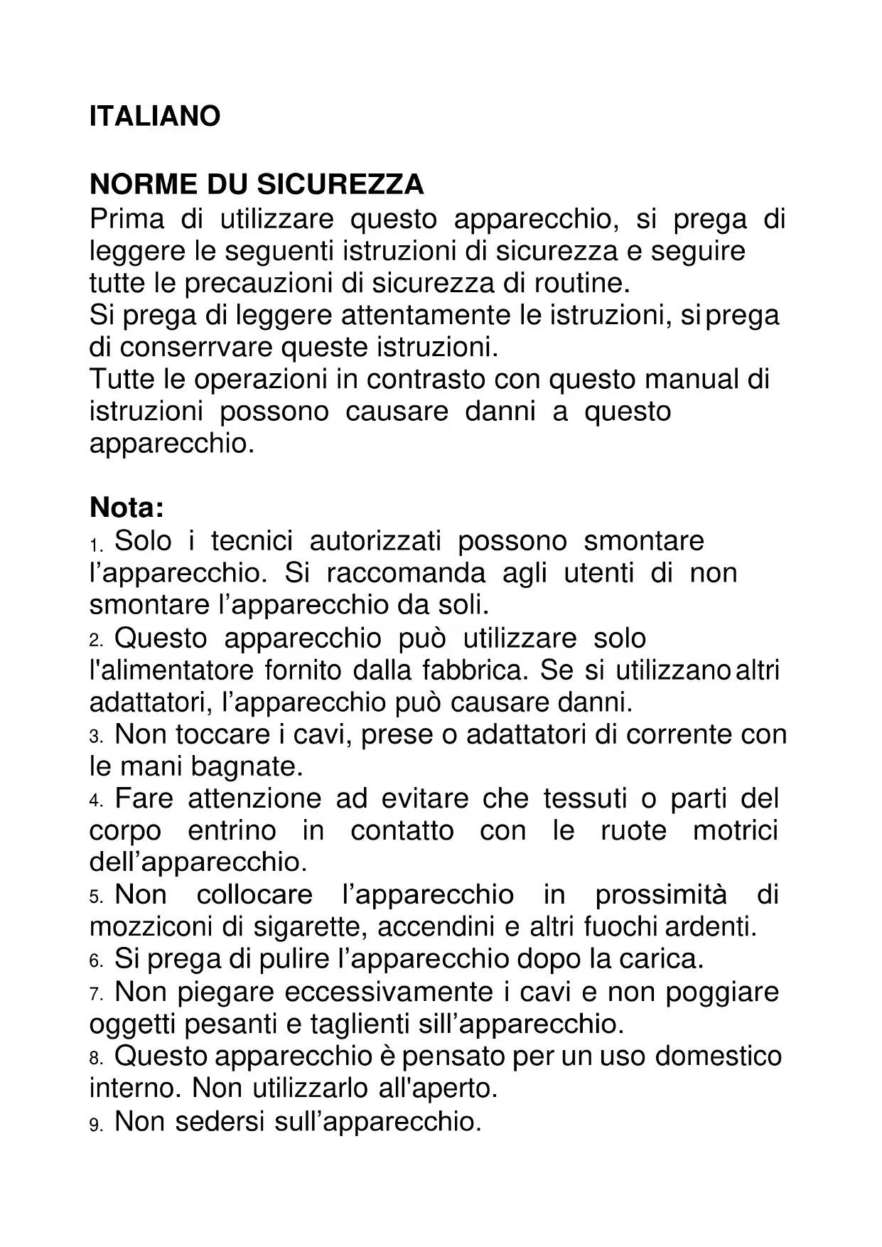 Prima di utilizzare questo apparecchio, si prega di leggere le seguenti istruzioni di sicurezza e seguire tutte le precauzioni di sicurezza di routine. Si prega di leggere attentamente le istruzioni, si prega di conserrvare queste istruzioni. Tutte le operazioni in contrasto con questo manual di istruzioni possono causare danni a questo apparecchio.