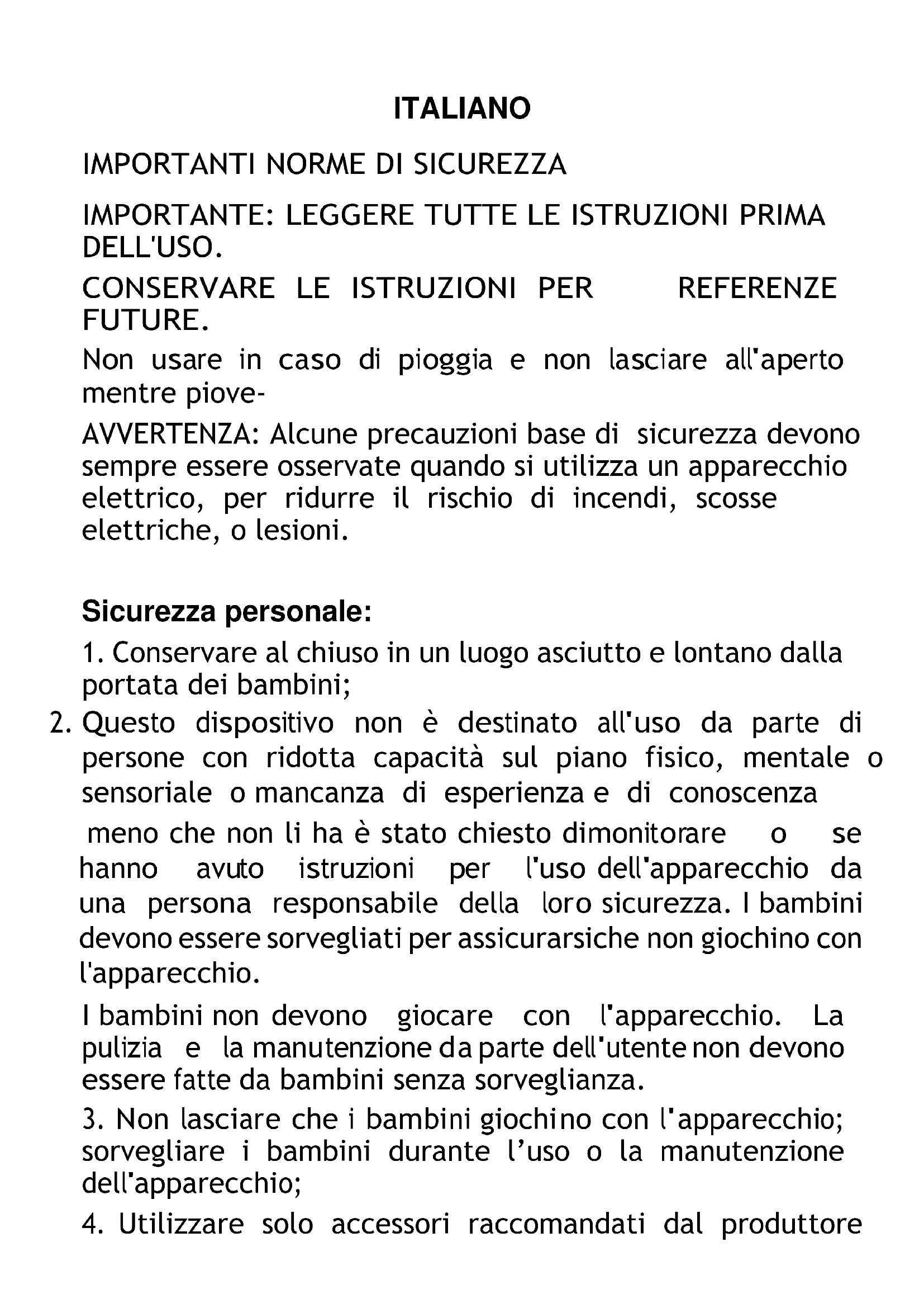 mentre piove- AVVERTENZA: Alcune precauzioni base di sicurezza devono sempre essere osservate quando si utilizza un apparecchio elettrico, per ridurre il rischio di incendi, scosse elettriche, o lesioni. Sicurezza personale: