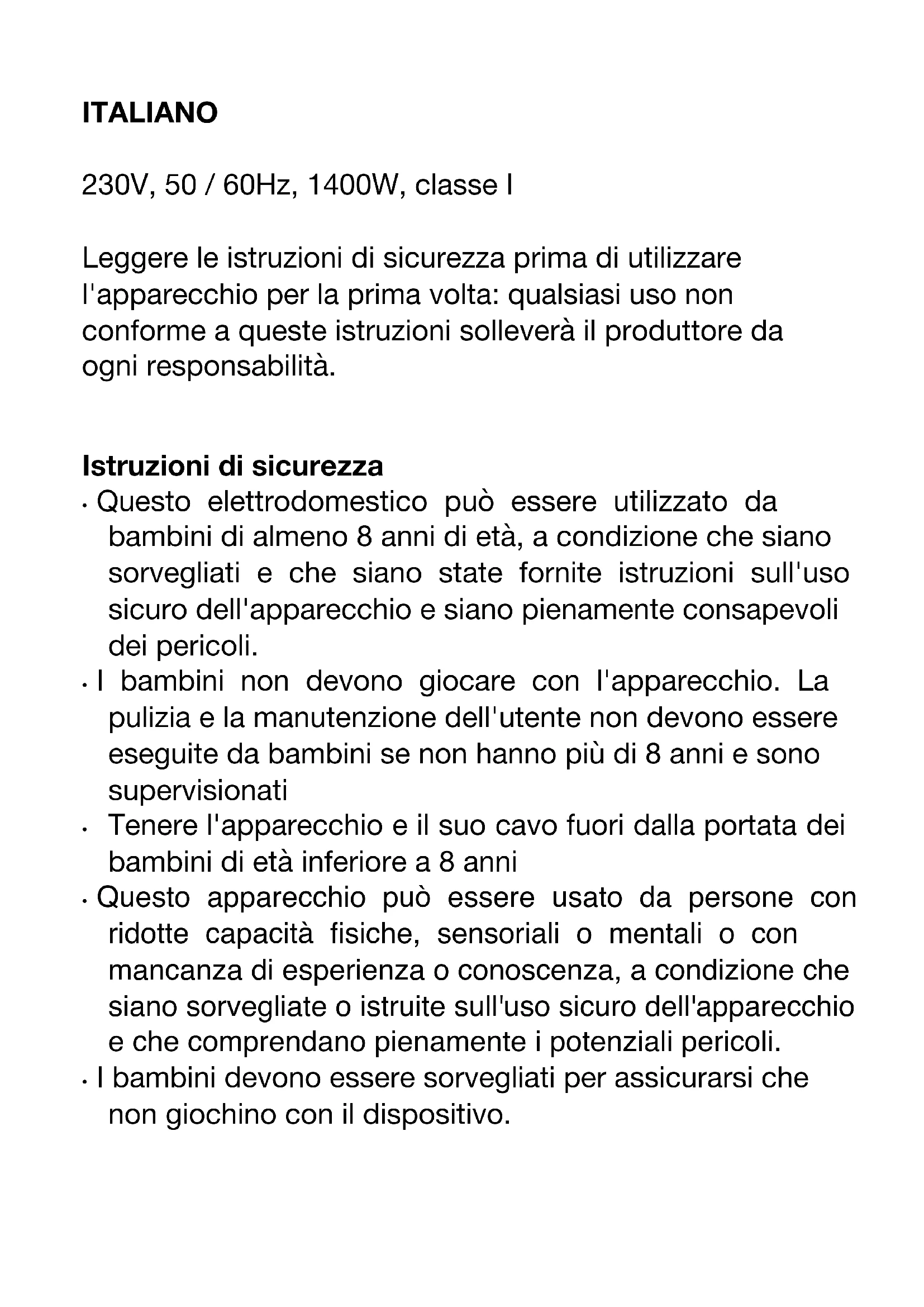 - Questo apparecchio può essere usato da persone con ridotte capacità fisiche, sensoriali o mentali o con mancanza di esperienza o conoscenza, a condizione che siano sorvegliate o istruite sull'uso sicuro dell'apparecchio e che comprendano pienamente i potenziali pericoli.