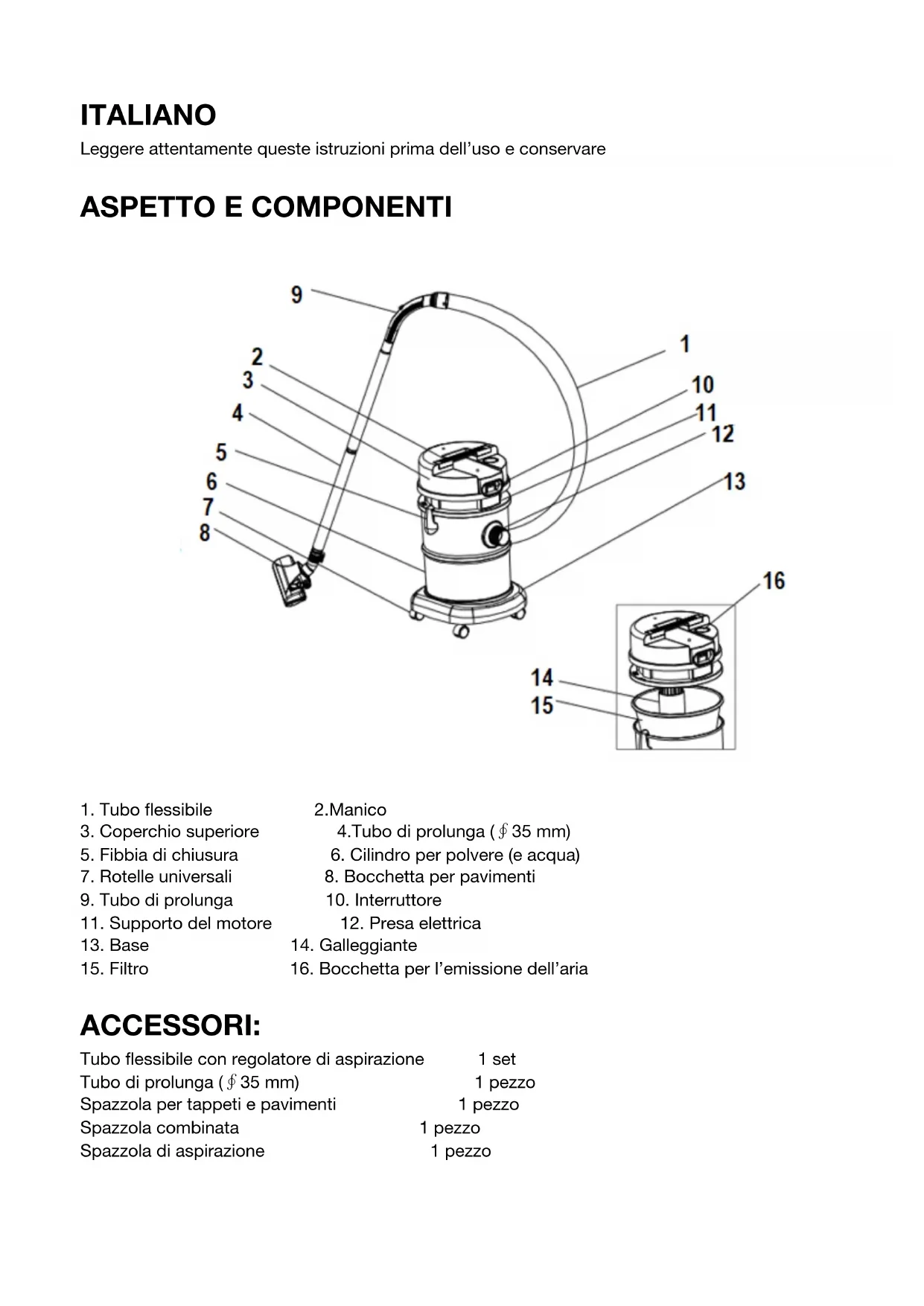 ACCESSORI: Tubo flessibile con regolatore di aspirazione 1 set Tubo di prolunga (∮35 mm) 1 pezzo Spazzola per tappeti e pavimenti 1 pezzo Spazzola combinata 1 pezzo Spazzola di aspirazione 1 pezzoCARATTERISTICHE