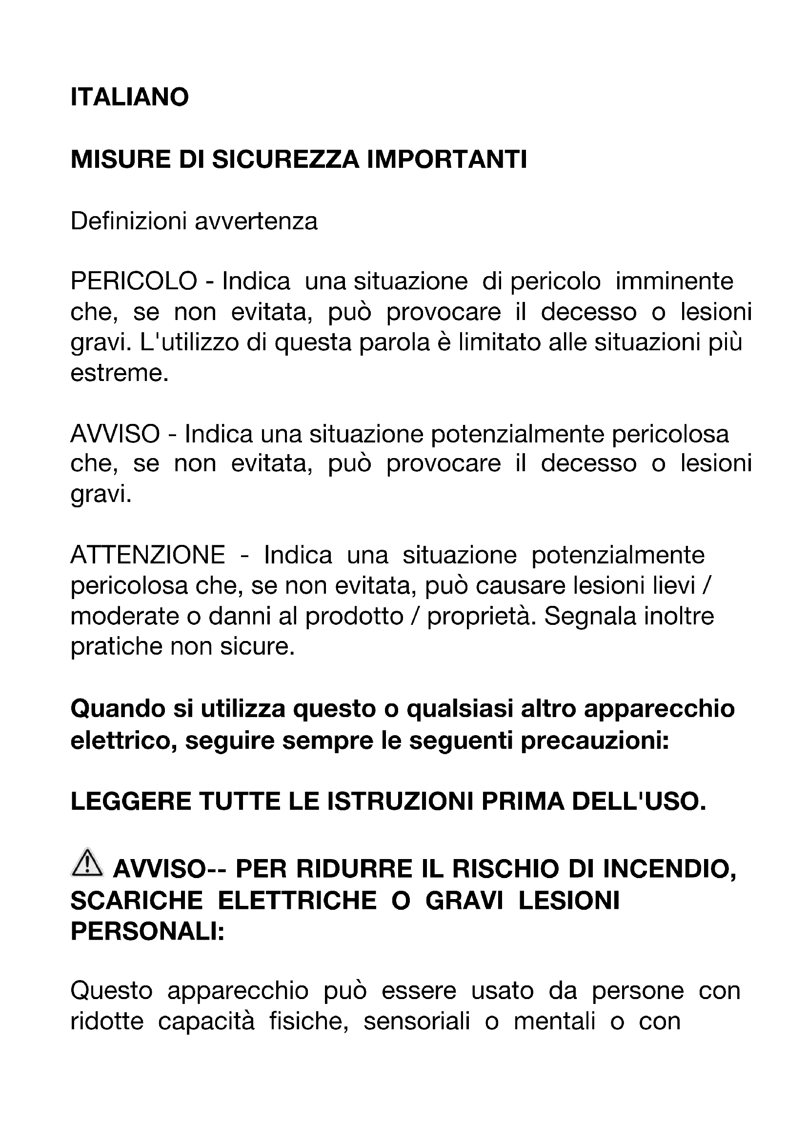 Definizioni avvertenza PERICOLO - Indica una situazione di pericolo imminente che, se non evitata, può provocare il decesso o lesioni gravi. L'utilizzo di questa parola è limitato alle situazioni più estreme. AVVISO - Indica una situazione potenzialmente pericolosa che, se non evitata, può provocare il decesso o lesioni gravi. ATTENZIONE - Indica una situazione potenzialmente pericolosa che, se non evitata, può causare lesioni lievi / moderate o danni al prodotto / proprietà. Segnala inoltre pratiche non sicure. Quando si utilizza questo o qualsiasi altro apparecchio elettrico, seguire sempre le seguenti precauzioni: LEGGERE TUTTE LE ISTRUZIONI PRIMA DELL'USO. AVVISO-- PER RIDURRE IL RISCHIO DI INCENDIO,