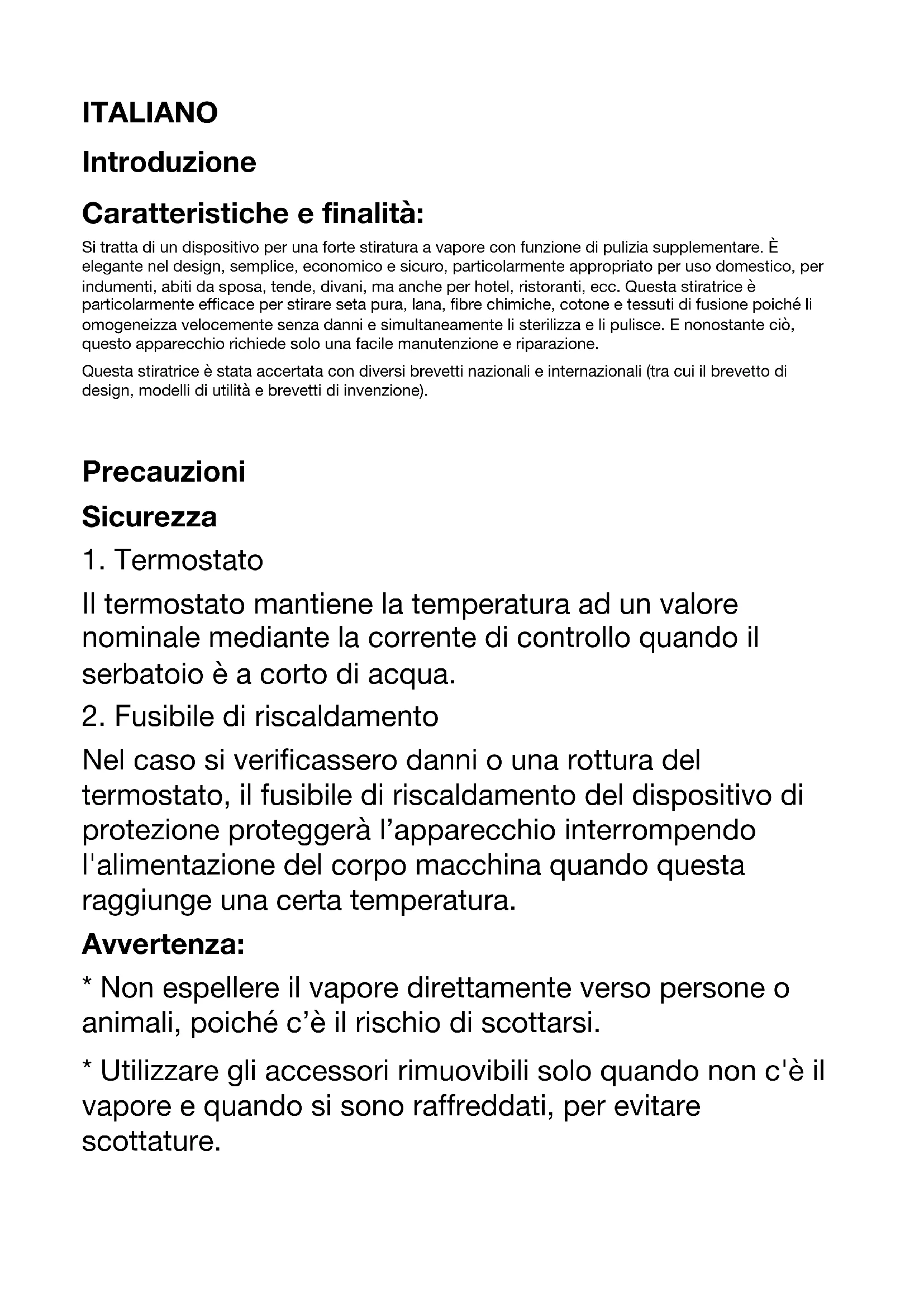 - Il vostro apparecchio è stato progettato esclusivamente per un uso domestico. Non è destinato all'uso nelle seguenti situazioni che non sono coperte dalla garanzia: - in cucine per il personale in negozi, uffici e altri ambienti professionali, - in ostelli agricoli, - da ospiti in hotel, motel e altri ambienti residenziali, - in ambienti tipo bed and breakfast. Rispettare le seguenti indicazioni per la propria sicurezza e quella degli altri. Note Collegare correttamente il cavo di alimentazione per evitare scosse elettriche, circuito aperto, corto circuito, fumo e incendi causati da un eccesso di calore della spina. Utilizzare la presa con tensione nominale di 220V-250V separatamente da altri apparecchi elettrici, in caso contrario, potrebbero verificarsi fiamme a causa del calore. Non immergere l’apparecchio: pericolo di corto circuito e scosse elettriche. Non tirare o inserire la spina con le mani bagnate per evitare scosse elettriche. Non usare una presa rotta o allentata in per evitare scosse elettriche, corto circuiti e incendi. Tenersi lontani dal foro del vapore per evitare ustioni. Non rimontare, rimuovere o riparare l’apparecchio per evitare incendi, scosse elettriche o altre lesioni. Tenere lontano dai bambini o altre persone in grado di operare l’apparecchio. Non inserire l'ago di metallo nel foro di dissipazione del calore o pulizia per evitare lesioni causate da scosse elettriche. Rimuovere la polvere sulla spina di alimentazione a intervalli regolari, in caso contrario, incidente causati dal fuoco potrebbero verificarsi a causa di scarso isolamento. Non mettere il prodotto in acqua o ambienti umidi o vicino ad altre fonti di calore, e non mettere la caldaia interna sul fuoco. Non toccare le parti calde, in particolare la superficie del getto di vapore di stiratura della spazzola durante o dopo l'operazione. Per staccare la spina non tirare il cavo di alimentazione ma tenere direttamente la spina. Non utilizzare un cavo di alimentazione che non dovrebbe essere usato per collegare altre apparecchiature. Non utilizzare l’apparecchio su una piattaforma instabile o su cuscini per non correre il rischio di incendi causati dalla caduta della spazzola. Se non in uso, staccare la spina dalla presa di corrente per evitare scosse elettriche, dispersione e fiamme derivanti da danni o dall'invecchiamento dell’ isolamento.Lavare la spazzola dopo il totale raffreddamento per evitare scottature. Non disporre l’apparecchio vicino a una parete o un mobile nel caso in cui il vapore producesse un cambiamento di colore o la deformazione degli stessi. Tenerlo a più di 30 cm di distanza dal muro e dai mobili.