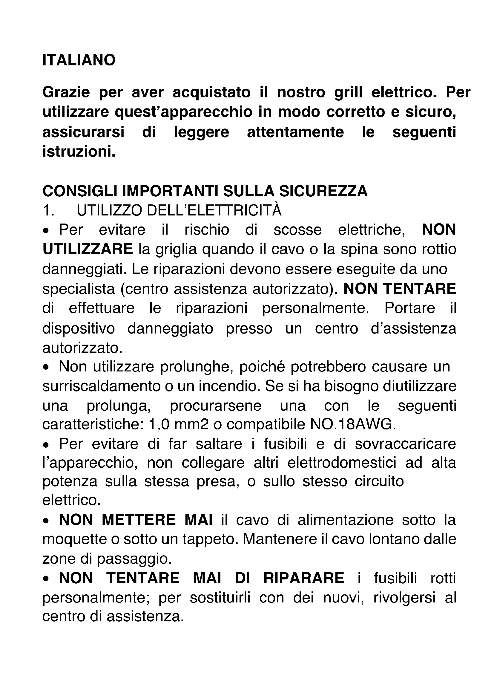 Per evitare il rischio di scosse elettriche, NON UTILIZZARE la griglia quando il cavo o la spina sono rotti o danneggiati. Le riparazioni devono essere eseguite da uno specialista (centro assistenza autorizzato). NON TENTARE di effettuare le riparazioni personalmente. Portare il dispositivo danneggiato presso un centro d’assistenza autorizzato.