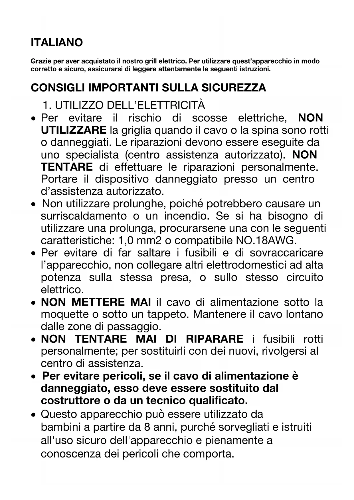 - Per evitare il rischio di scosse elettriche, NON UTILIZZARE la griglia quando il cavo o la spina sono rotti o danneggiati. Le riparazioni devono essere eseguite da uno specialista (centro assistenza autorizzato). NON TENTARE di effettuare le riparazioni personalmente. Portare il dispositivo danneggiato presso un centro d’assistenza autorizzato.