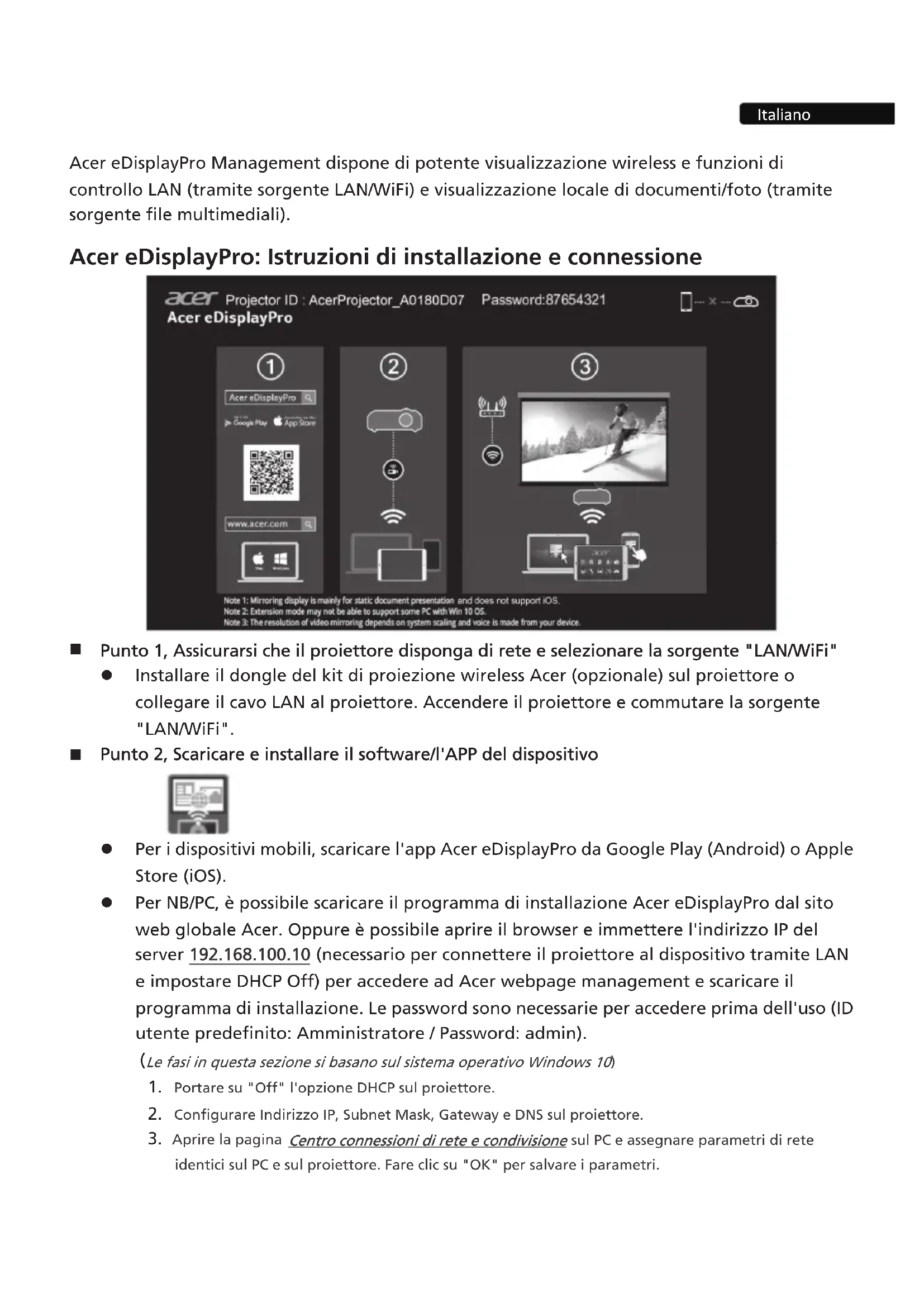 Punto 2, Scaricare e installare il software/l'APP del dispositivo z Per i dispositivi mobili, scaricare l'app Acer eDisplayPro da Google Play (Android) o Apple Store (iOS). z Per NB/PC, è possibile scaricare il programma di installazione Acer eDisplayPro dal sito web globale Acer. Oppure è possibile aprire il browser e immettere l'indirizzo IP del server