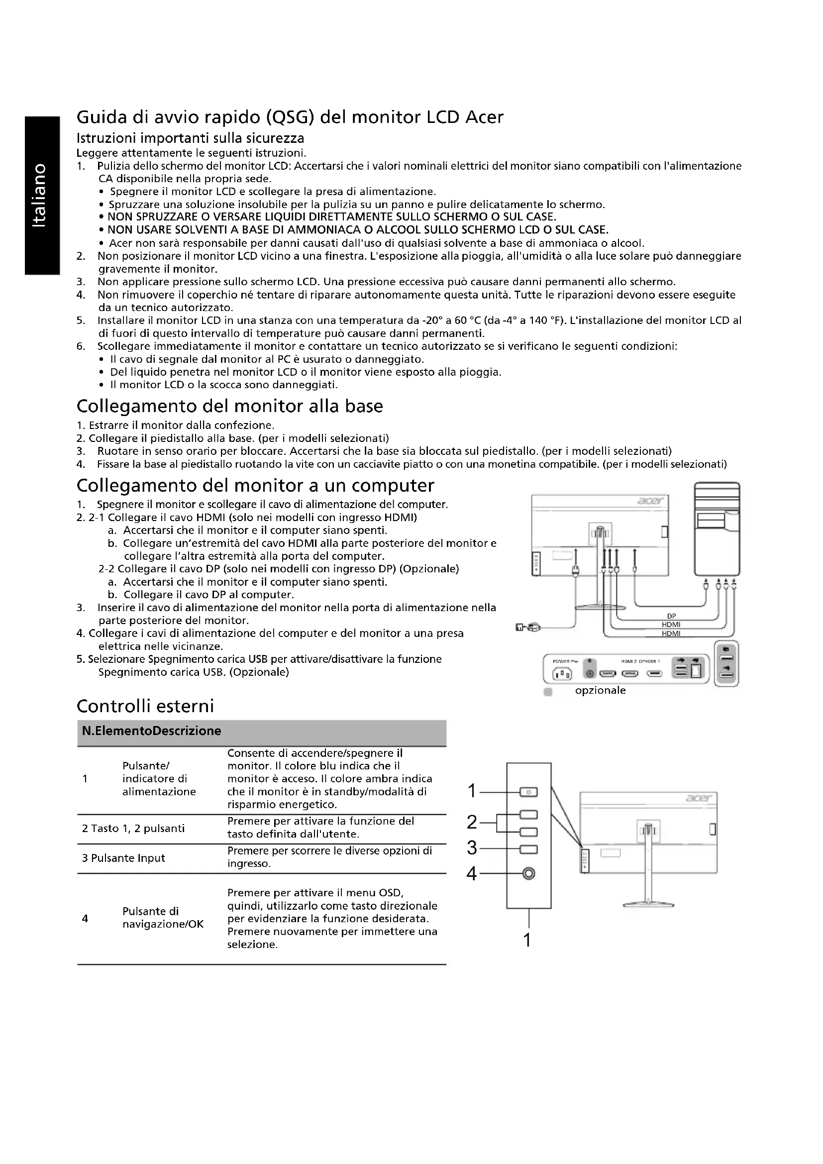 4Italiano Norme e avvisi di sicurezza Normative FCC Questo dispositivo è stato testato ed è risultato conforme ai limiti stabiliti per i dispositivi digitali di Classe B, ai sensi della Parte 15 delle Normative FCC. Tali limiti sono stati stabiliti per fornire una ragionevole protezione da interferenze nocive presenti nelle installazioni residenziali. Questo dispositivo genera, utilizza e può emettere frequenze radio, e se non è installato e utilizzato secondo le istruzioni, può causare un'interferenza dannosa alle comunicazioni radio. Tuttavia, non vi è alcuna garanzia che l'interferenza non si verifichi in particolari installazioni. Se il dispositivo causa un'interferenza dannosa alla ricezione di radio e televisori, che può essere determinata spegnendo e accendendo il dispositivo, si prega l'utente di correggere l'interferenza applicando una o più delle seguenti misure: Riorientare o riposizionare l'antenna di ricezione. Aumentare la distanza tra il dispositivo e il ricevitore. Collegare il dispositivo a una presa su un circuito diverso da quello a cui è collegato il ricevitore. Per assistenza, contattare il rivenditore o un tecnico professionista nell'ambito di radio e televisori. Dichiarazione di conformità CE Con il presente documento, Acer Inc., dichiara che questo monitor LCD è conforme ai requisiti essenziali e ad altre normative pertinenti della Direttiva EMC 2014/30/UE, alla Direttiva sulla bassa tensione 2014/35/UE e alla Direttiva RoHS 2011/65/UE e alla Direttiva 2009/125/CE con riferimento all'istituzione di un quadro per l'elaborazione di specifiche per la progettazione ecocompatibile dei prodotti connessi al consumo energetico. Avviso: Per impedire danni al monitor, non sollevare il monitor per la sua base. Avviso: Cavi schermati Tutte i collegamenti ad altri dispositivi di elaborazione devono essere effettuati utilizzando cavi schermati per mantenere la conformità alle normative EMC. Avviso: Dispositivi periferici È possibile collegare a questa apparecchiatura solo le periferiche (dispositivi in ingresso/uscita, terminali, stampanti, ecc.) certificate per la conformità ai limiti della Classe B. L'uso di periferiche non certificate può causare interferenze alla ricezione di radio e TV. Avvertenza Eventuali modifiche o cambiamenti non espressamente approvati dal produttore potrebbero annullare l'autorità dell'utente, concessa dalla Federal Communications Commission, a utilizzare questo prodotto. Condizioni di utilizzo Questo dispositivo è conforme alla Parte 15 delle Normative FCC. L'utilizzo è soggetto alle seguenti due condizioni: (1) il dispositivo non deve causare interferenze dannose e (2) deve accettare tutte le interferenze ricevute, comprese quelle che possono causare un funzionamento indesiderato. Avviso: Utenti canadesi Questo apparecchio digitale di classe B è conforme alla normativa canadese ICES-003. Remarque à l'intention des utilisateurs canadiens Cet appareil numérique de la classe B est conforme à la norme NMB-003 du Canada. Smaltimento dei dispositivi utilizzati da parte di utenti privati nell'Unione Europea Questo simbolo sul prodotto o sulla confezione indica che il prodotto non deve essere smaltito insieme ai rifiuti domestici. È quindi responsabilità dell'utente smaltirlo portandolo presso un centro di raccolta autorizzato per il riciclo delle apparecchiature elettriche ed elettroniche. La raccolta differenziata e il riciclaggio di tali rifiuti provenienti da apparecchiature nel momento dello smaltimento aiuteranno a preservare le risorse naturali e garantiranno un riciclaggio adatto a proteggere il benessere dell'uomo e dell'ambiente. Per maggiori informazioni sui centri di raccolta, contattare il proprio ufficio locale, il servizio di smaltimento rifiuti o il negozio presso il quale è stato acquistato il prodotto.Italiano SPECIFICHE I manuali e altri documenti relativi al prodotto Acer sono disponibili sul sito Web di assistenza ufficiale Acer. *Il consumo energetico annuale viene calcolato utilizzando il consumo energetico tipico di 4 ore al giorni, 365 giorni all'anno. **FreeSync Premium offre prestazioni prive di artefatti. È compatibile con entrambe le tecnologie Nvidia G-Sync e AMD FreeSync Premium quando utilizzato insieme con le schede grafiche Nvidia/AMD. ***Con HDR attivato, uno schermo con attenuazione locale full array può presentare un effetto bagliore o alone a causa delle aree luminose che influiscono sulle immagini delle aree scure adiacenti. # L’overclocking può provocare lo sfarfallio o altri effetti negativi che possono derivare dalla configurazione complessiva del sistema collegato al display, ed anche, eventualmente, dalle specifiche del pannello dello schermo. Potrebbe essere possibile risolvere o ridurre questi effetti impostano una frequenza d’aggiornamento più bassa. Pannello LCD Sistema di trasmissione LCD a colori TFT Dimensioni 32”W (81 cm) Passo del pixel 0,276 mm (H) x 0,276 mm (V) Luminosità Nativa: 400 cd/m