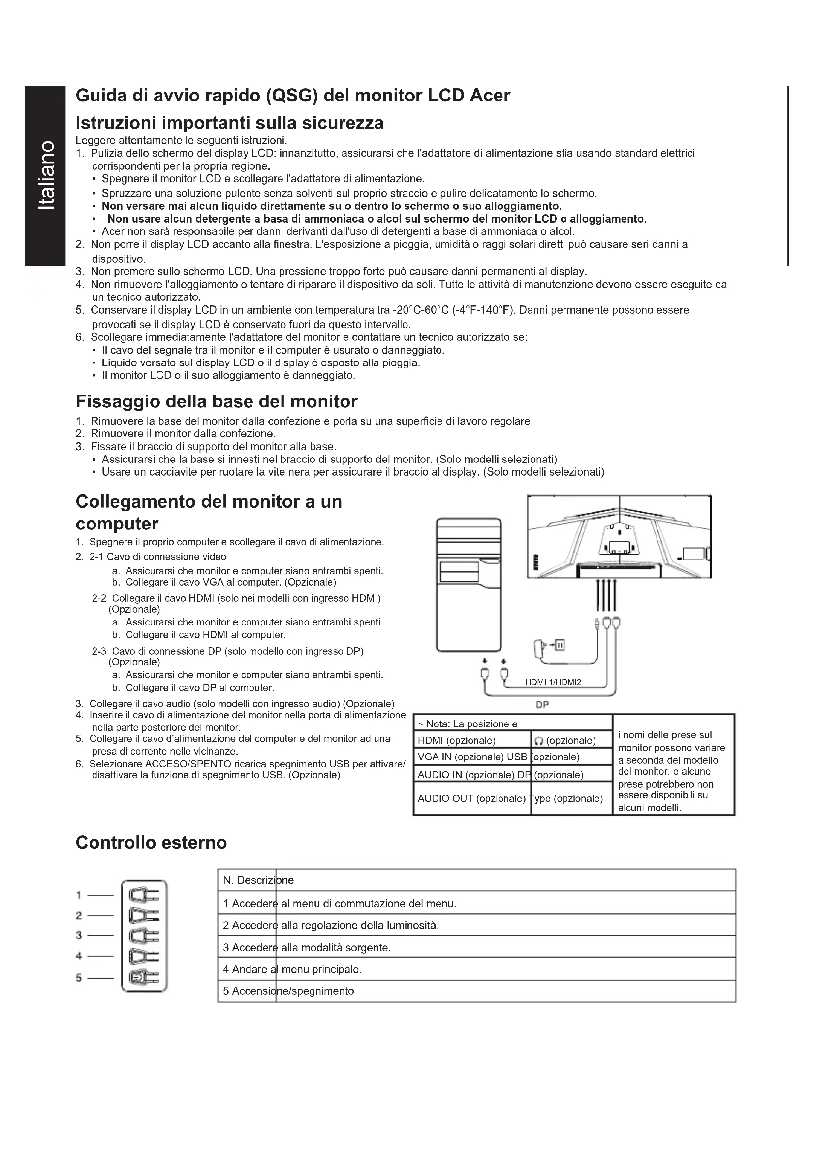 disattivare la funzione di spegnimento USB. (Opzionale) HDMI 1/HDMI2 ~ Nota: La posizione e i nomi delle prese sul monitor possono variare a seconda del modello del monitor, e alcune prese potrebbero non essere disponibili su alcuni modelli. HDMI (opzionale) (opzionale) VGA IN (opzionale) USB (opzionale) AUDIO IN (opzionale) DP (opzionale) AUDIO OUT (opzionale) Type (opzionale) Controllo esterno N. Descrizione 1 Accedere al menu di commutazione del menu. 2 Accedere alla regolazione della luminosità. 3 Accedere alla modalità sorgente. 4 Andare al menu principale. 5 Accensione/spegnimentoItaliano Dichiarazioni normative e di sicurezza. Dichiarazione FCC Questo dispositivo è stato testato e considerato conforme ai limiti per dispositivi digitali di Classe B, secondo la Parte 15 dei Regolamenti FCC. Questi limiti sono ritenuti fornire una protezione ragionevole contro l'interferenza nociva quando il dispositivo è installato in un'area residenziale. Questo dispositivo genera, usa e può irradiare energia di radiofrequenza, e se non installato e usato in conformità con queste istruzioni, può causare interferenza alle comunicazioni radio. Tuttavia, non c'è alcuna garanzia che l'interferenza non si verifichi in un impianto specifico. Se il dispositivo causa interferenza alla ricezione radio o televisiva (che può essere determinata da un commutatore), si raccomanda che l'utente prenda una o più delle seguenti misure per eliminare l'interferenza: