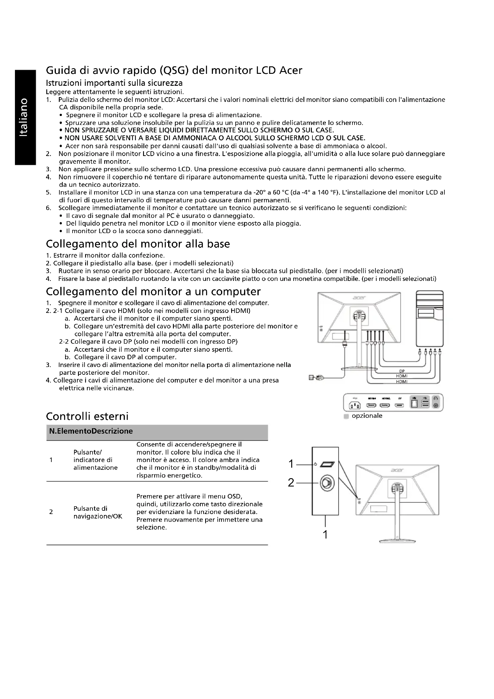 2Italiano Norme e avvisi di sicurezza Normative FCC Questo dispositivo è stato testato ed è risultato conforme ai limiti stabiliti per i dispositivi digitali di Classe B, ai sensi della Parte 15 delle Normative FCC. Tali limiti sono stati stabiliti per fornire una ragionevole protezione da interferenze nocive presenti nelle installazioni residenziali. Questo dispositivo genera, utilizza e può emettere frequenze radio, e se non è installato e utilizzato secondo le istruzioni, può causare un'interferenza dannosa alle comunicazioni radio. Tuttavia, non vi è alcuna garanzia che l'interferenza non si verifichi in particolari installazioni. Se il dispositivo causa un'interferenza dannosa alla ricezione di radio e televisori, che può essere determinata spegnendo e accendendo il dispositivo, si prega l'utente di correggere l'interferenza applicando una o più delle seguenti misure: Riorientare o riposizionare l'antenna di ricezione. Aumentare la distanza tra il dispositivo e il ricevitore. Collegare il dispositivo a una presa su un circuito diverso da quello a cui è collegato il ricevitore. Per assistenza, contattare il rivenditore o un tecnico professionista nell'ambito di radio e televisori. Dichiarazione di conformità CE Con il presente documento, Acer Inc., dichiara che questo monitor LCD è conforme ai requisiti essenziali e ad altre normative pertinenti della Direttiva EMC 2014/30/UE, alla Direttiva sulla bassa tensione 2014/35/UE e alla Direttiva RoHS 2011/65/UE e alla Direttiva 2009/125/CE con riferimento all'istituzione di un quadro per l'elaborazione di specifiche per la progettazione ecocompatibile dei prodotti connessi al consumo energetico. Avviso: Per impedire danni al monitor, non sollevare il monitor per la sua base. Avviso: Cavi schermati Tutte i collegamenti ad altri dispositivi di elaborazione devono essere effettuati utilizzando cavi schermati per mantenere la conformità alle normative EMC. Avviso: Dispositivi periferici È possibile collegare a questa apparecchiatura solo le periferiche (dispositivi in ingresso/uscita, terminali, stampanti, ecc.) certificate per la conformità ai limiti della Classe B. L'uso di periferiche non certificate può causare interferenze alla ricezione di radio e TV. Avvertenza Eventuali modifiche o cambiamenti non espressamente approvati dal produttore potrebbero annullare l'autorità dell'utente, concessa dalla Federal Communications Commission, a utilizzare questo prodotto. Condizioni di utilizzo Questo dispositivo è conforme alla Parte 15 delle Normative FCC. L'utilizzo è soggetto alle seguenti due condizioni: (1) il dispositivo non deve causare interferenze dannose e (2) deve accettare tutte le interferenze ricevute, comprese quelle che possono causare un funzionamento indesiderato. Avviso: Utenti canadesi Questo apparecchio digitale di classe B è conforme alla normativa canadese ICES-003. Remarque à l'intention des utilisateurs canadiens Cet appareil numérique de la classe B est conforme à la norme NMB-003 du Canada. Smaltimento dei dispositivi utilizzati da parte di utenti privati nell'Unione Europea Questo simbolo sul prodotto o sulla confezione indica che il prodotto non deve essere smaltito insieme ai rifiuti domestici. È quindi responsabilità dell'utente smaltirlo portandolo presso un centro di raccolta autorizzato per il riciclo delle apparecchiature elettriche ed elettroniche. La raccolta differenziata e il riciclaggio di tali rifiuti provenienti da apparecchiature nel momento dello smaltimento aiuteranno a preservare le risorse naturali e garantiranno un riciclaggio adatto a proteggere il benessere dell'uomo e dell'ambiente. Per maggiori informazioni sui centri di raccolta, contattare il proprio ufficio locale, il servizio di smaltimento rifiuti o il negozio presso il quale è stato acquistato il prodotto.Italiano SPECIFICHE I manuali e altri documenti relativi al prodotto Acer sono disponibili sul sito Web di assistenza ufficiale Acer. Pannello LCD Sistema di trasmissione LCD a colori TFT Dimensioni 23,6”W (60 cm) Passo del pixel 0,271 mm (H) x 0,271 mm (V) Luminosità 250 cd/m