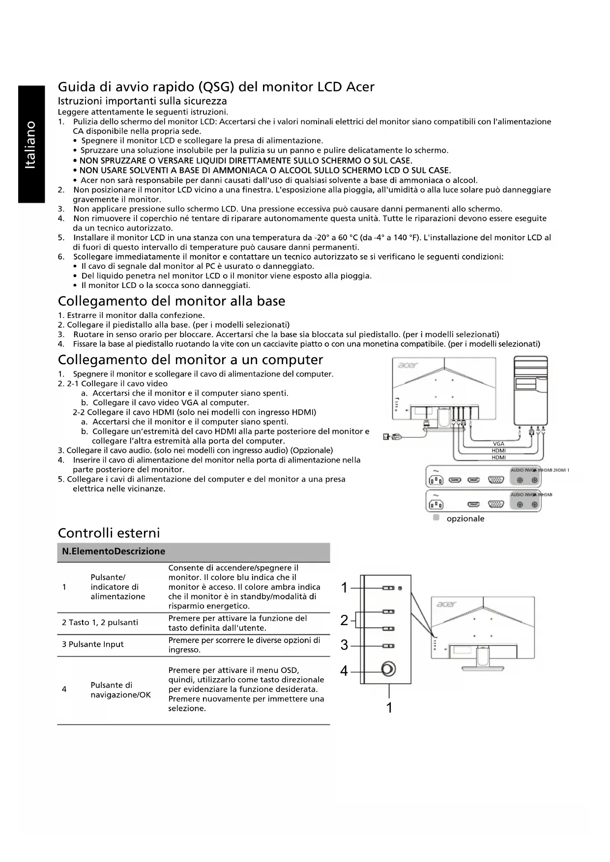 parte posteriore del monitor.5. Collegare i cavi di alimentazione del computer e del monitor a una presa elettrica nelle vicinanze. Controlli esterni N. Elemento Descrizione