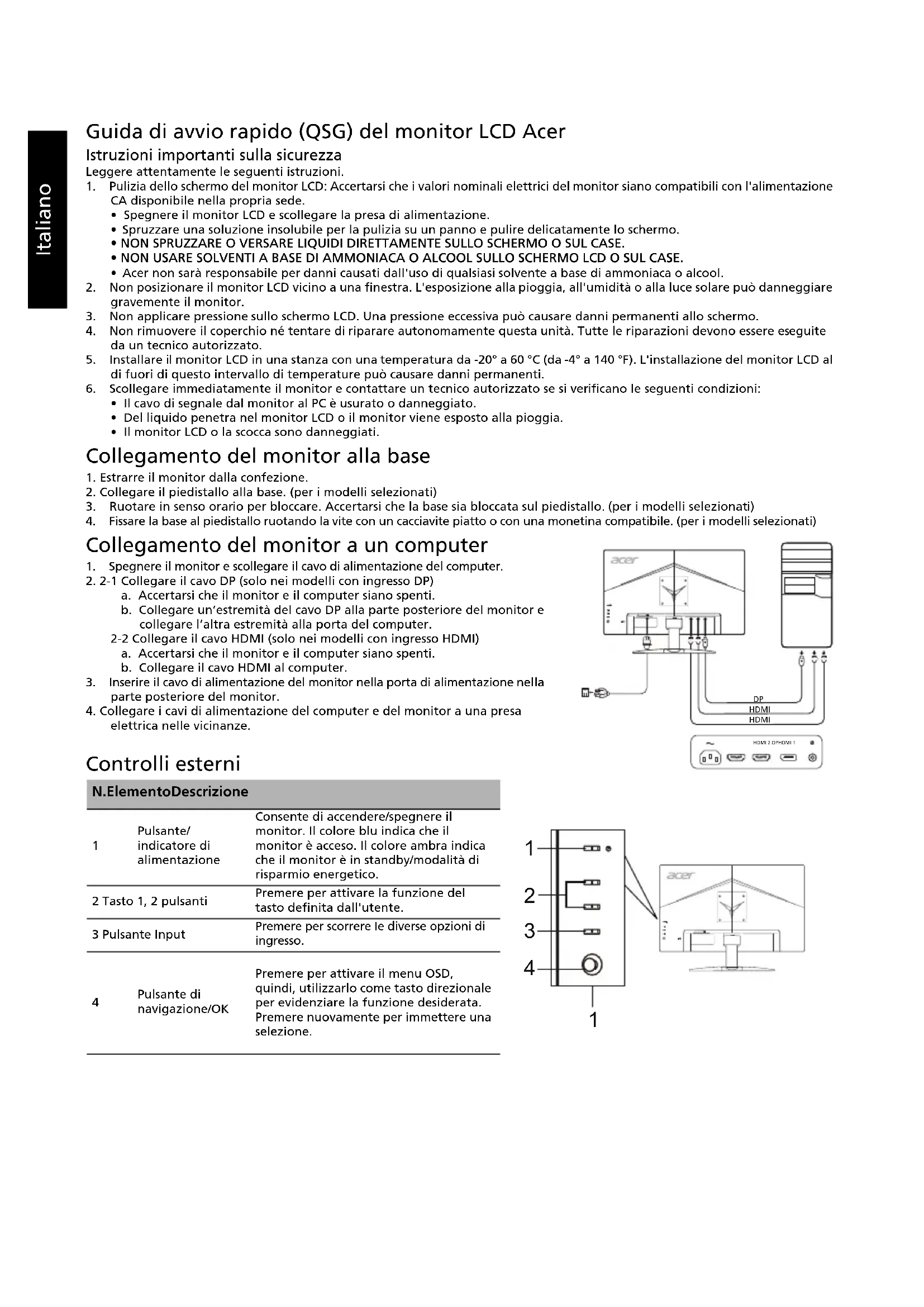parte posteriore del monitor.4. Collegare i cavi di alimentazione del computer e del monitor a una presa elettrica nelle vicinanze. Controlli esterni N. Elemento Descrizione