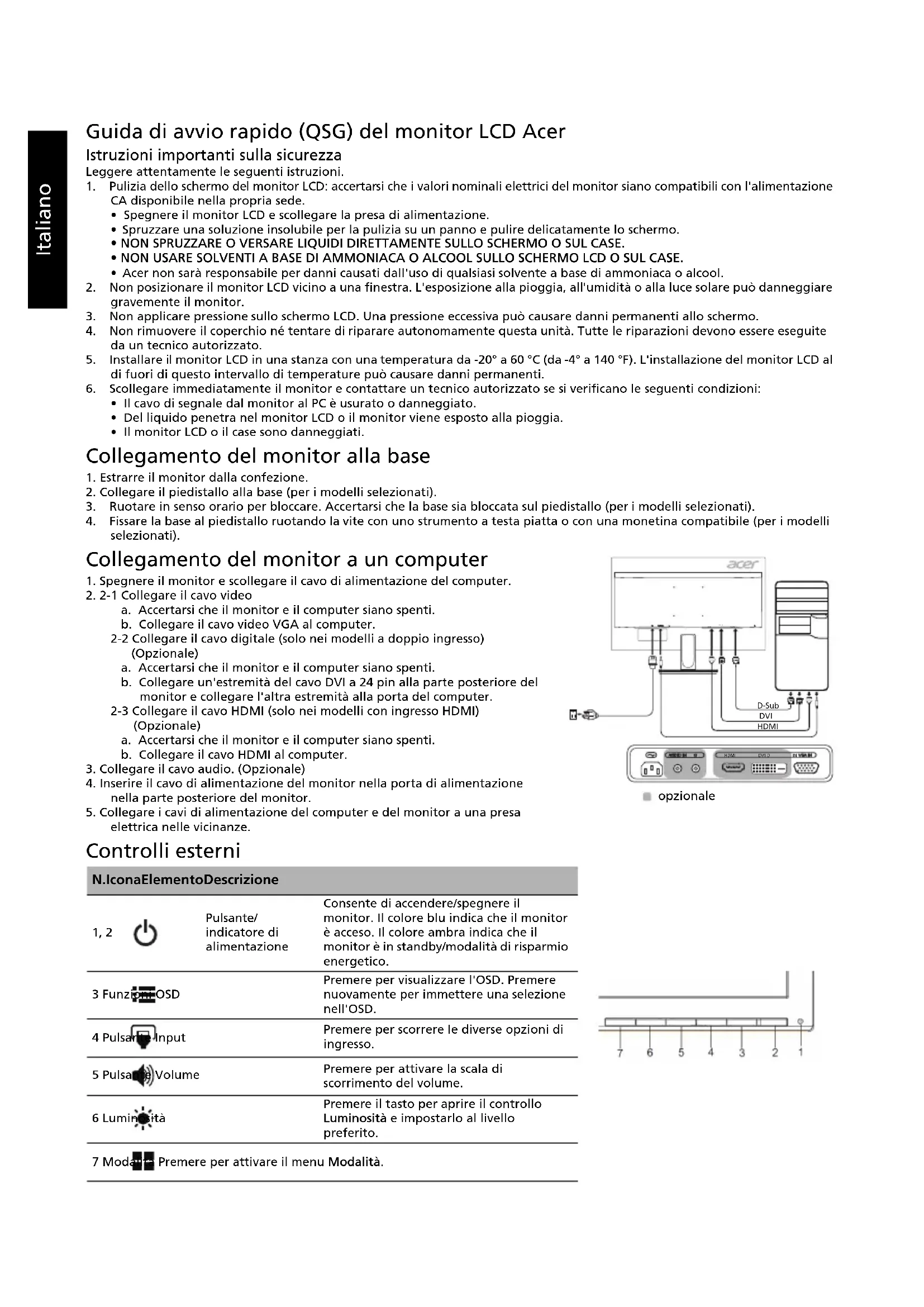 HDMI D-Sub DVI opzionaleItaliano Norme e avvisi di sicurezza Normative FCC Questo dispositivo è stato testato ed è risultato conforme ai limiti stabiliti per i dispositivi digitali di Classe B, ai sensi della Parte 15 delle Normative FCC. Tali limiti sono stati stabiliti per fornire una ragionevole protezione da interferenze nocive presenti nelle installazioni residenziali. Questo dispositivo genera, utilizza e può emettere frequenze radio, e se non è installato e utilizzato secondo le istruzioni, può causare un'interferenza dannosa alle comunicazioni radio. Tuttavia, non vi è alcuna garanzia che l'interferenza non si verifichi in particolari installazioni. Se il dispositivo causa un'interferenza dannosa alla ricezione di radio e televisori, che può essere determinata spegnendo e accendendo il dispositivo, si prega l'utente di correggere l'interferenza applicando una o più delle seguenti misure: Riorientare o riposizionare l'antenna di ricezione. Aumentare la distanza tra il dispositivo e il ricevitore. Collegare il dispositivo a una presa su un circuito diverso da quello a cui è collegato il ricevitore. Per assistenza, contattare il rivenditore o un tecnico professionista nell'ambito di radio e televisori. Dichiarazione di conformità CE Con il presente documento, Acer Inc., dichiara che questo monitor LCD è conforme ai requisiti essenziali e ad altre normative pertinenti della Direttiva EMC 2014/30/UE, alla Direttiva sulla bassa tensione 2014/35/UE e alla Direttiva RoHS 2011/65/UE e alla Direttiva 2009/125/CE con riferimento all'istituzione di un quadro per l'elaborazione di specifiche per la progettazione ecocompatibile dei prodotti connessi al consumo energetico. Avviso: Per impedire danni al monitor, non sollevare il monitor per la sua base. Avviso: cavi schermati Tutte i collegamenti ad altri dispositivi di elaborazione devono essere effettuati utilizzando cavi schermati per mantenere la conformità alle normative EMC. Avviso: dispositivi periferici È possibile collegare a questa apparecchiatura solo le periferiche (dispositivi in ingresso/uscita, terminali, stampanti, ecc.) certificate per la conformità ai limiti della Classe B. L'uso di periferiche non certificate può causare interferenze alla ricezione di radio e TV. Avvertenza Eventuali modifiche o cambiamenti non espressamente approvati dal produttore potrebbero annullare l'autorità dell'utente, concessa dalla Federal Communications Commission, a utilizzare questo prodotto. Condizioni di utilizzo Questo dispositivo è conforme alla Parte 15 delle Normative FCC. Il funzionamento è soggetto alle seguenti due condizioni: (1) il dispositivo non deve causare interferenze dannose e (2) deve accettare tutte le interferenze ricevute, comprese quelle che possono causare un funzionamento indesiderato. Avviso: utenti canadesi Questo apparecchio digitale di classe B è conforme alla normativa canadese ICES-003. Remarque à l'intention des utilisateurs canadiens Cet appareil numérique de la classe B est conforme à la norme NMB-003 du Canada. Smaltimento dei dispositivi utilizzati da parte di utenti privati nell'Unione Europea Questo simbolo sul prodotto o sulla confezione indica che il prodotto non deve essere smaltito insieme ai rifiuti domestici. È quindi responsabilità dell'utente smaltirlo portandolo presso un centro di raccolta autorizzato per il riciclo delle apparecchiature elettriche ed elettroniche. La raccolta differenziata e il riciclaggio di tali rifiuti provenienti da apparecchiature nel momento dello smaltimento aiuteranno a preservare le risorse naturali e garantiranno un riciclaggio adatto a proteggere il benessere dell'uomo e dell'ambiente. Per maggiori informazioni sui centri di raccolta, contattare il proprio ufficio locale, il servizio di smaltimento rifiuti o il negozio presso il quale è stato acquistato il prodotto.Italiano SPECIFICHE I manuali e altri documenti relativi al prodotto Acer sono disponibili sul sito Web di assistenza ufficiale Acer.