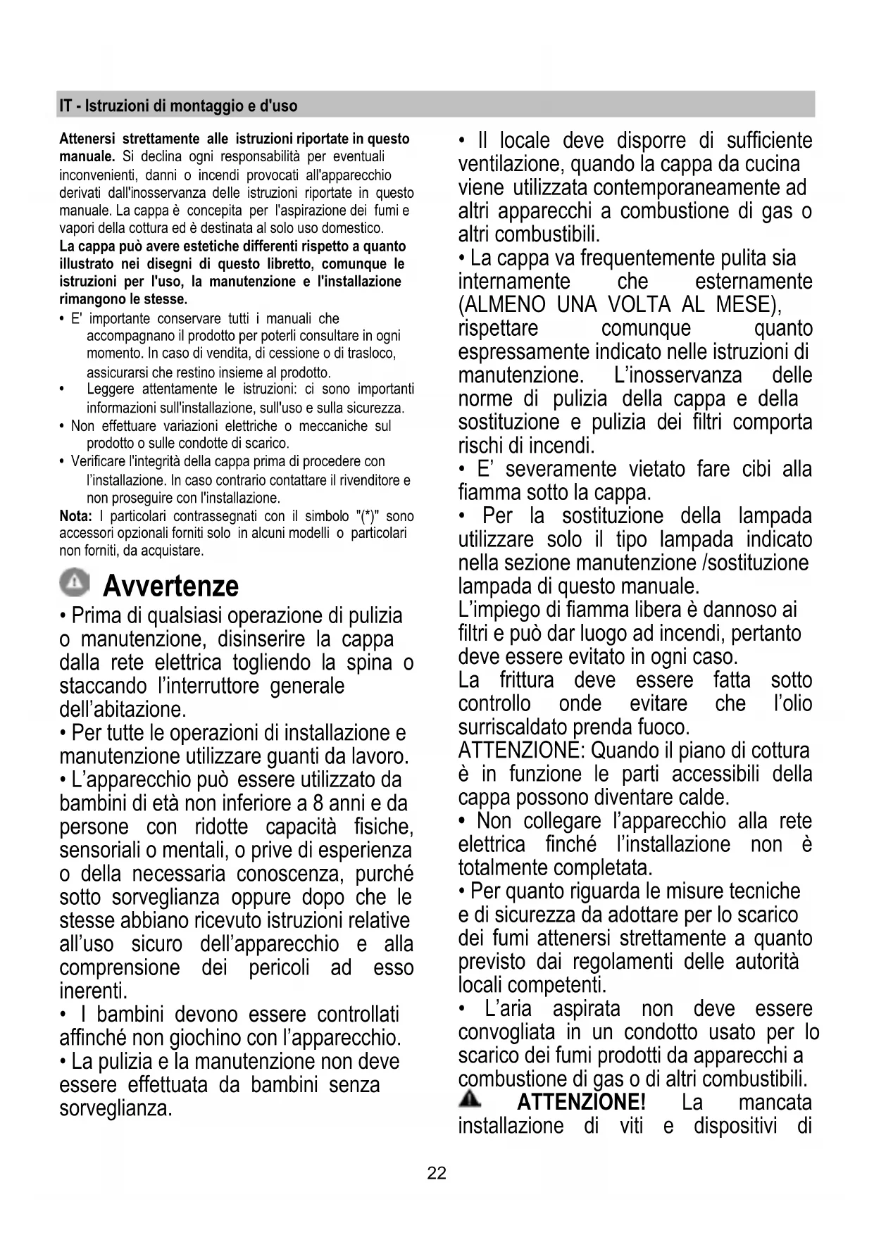 +22 IT - Istruzioni di montaggio e d'uso Attenersi strettamente alle istruzioni riportate in questo manuale. Si declina ogni responsabilità per eventuali inconvenienti, danni o incendi provocati all'apparecchio derivati dall'inosservanza delle istruzioni riportate in questo manuale. La cappa è concepita per l'aspirazione dei fumi e vapori della cottura ed è destinata al solo uso domestico. La cappa può avere estetiche differenti rispetto a quanto illustrato nei disegni di questo libretto, comunque le istruzioni per l'uso, la manutenzione e l'installazione rimangono le stesse.