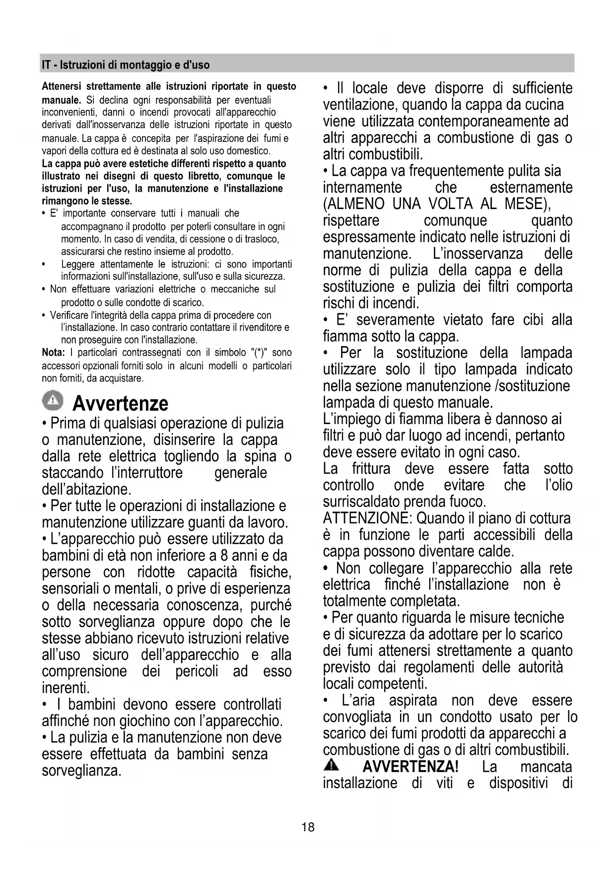 IT - Istruzioni di montaggio e d'uso Attenersi strettamente alle istruzioni riportate in questo manuale. Si declina ogni responsabilità per eventuali inconvenienti, danni o incendi provocati all'apparecchio derivati dall'inosservanza delle istruzioni riportate in questo manuale. La cappa è concepita per l'aspirazione dei fumi e vapori della cottura ed è destinata al solo uso domestico. La cappa può avere estetiche differenti rispetto a quanto illustrato nei disegni di questo libretto, comunque le istruzioni per l'uso, la manutenzione e l'installazione rimangono le stesse.