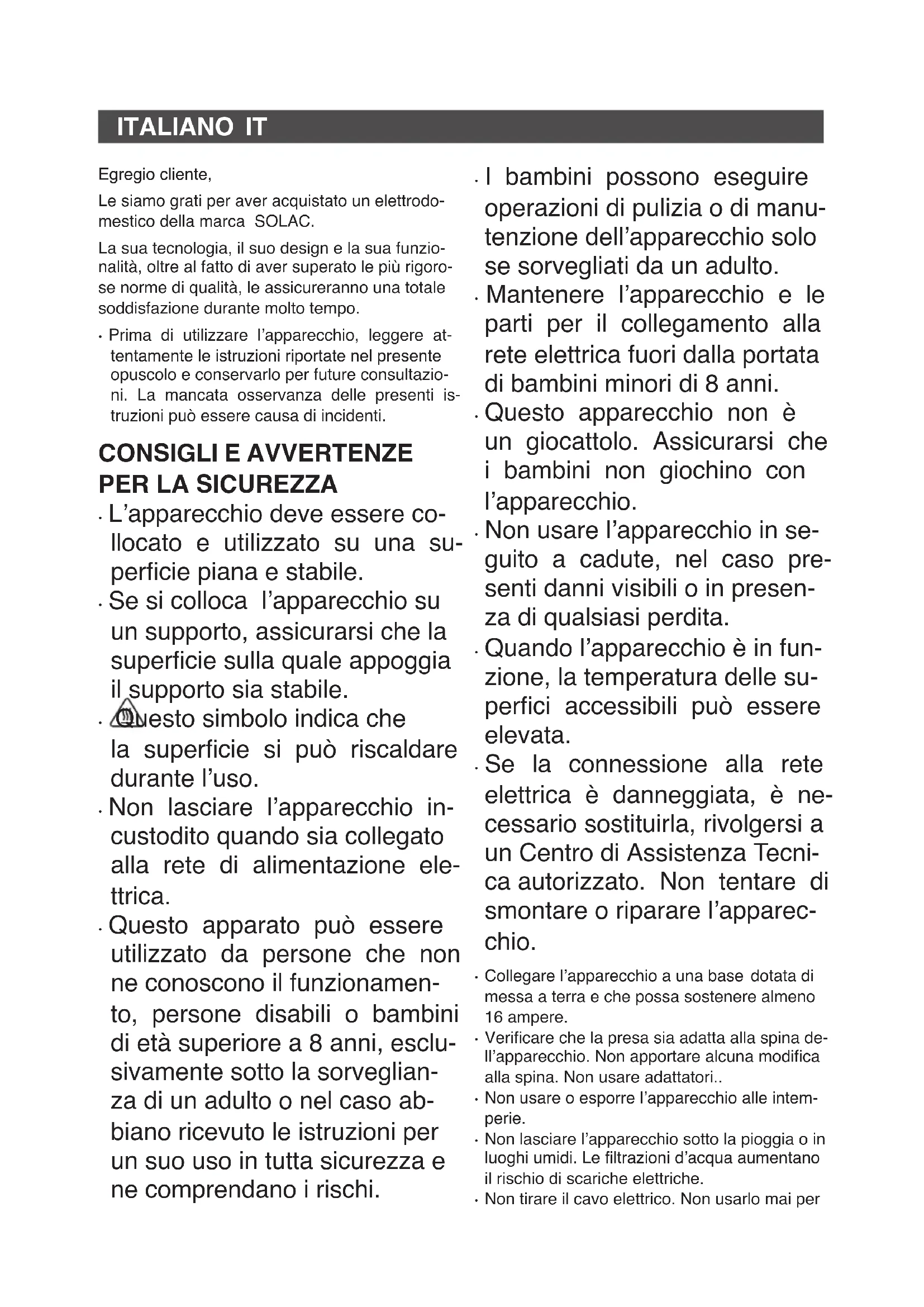 - Il prodotto non contiene sostanze danno- se per l’ambiente. - Questo simbolo indica che, per smaltire il prodotto al termine della sua durata uti- le, occorre depositarlo presso un ente di smal- timento autorizzato alla raccolta differenziata di riuti di apparecchiature elettriche ed elettroni- che (RAEE). Questo apparecchio rispetta la Direttiva 2014/35/UE di Bassa Tensione, la Direttiva 2014/30/UE di Compatibilità Elettromagnetica, la Direttiva 2011/65/UE sui limiti d’impiego di de- terminate sostanze pericolose negli apparecchi elettrici ed elettronici e la Direttiva 2009/125/CE riguardante l’Ecodesign dei prodotti che consu- mano energia. ITNEDERLANDS NL Geachte klant: We danken u voor de aankoop van een product van het merk SOLAC. De technologie, het ontwerp en de functionaliteit van dit product, dat voldoet aan de meest strik- te kwaliteitseisen, staan garant voor langdurige tevredenheid.