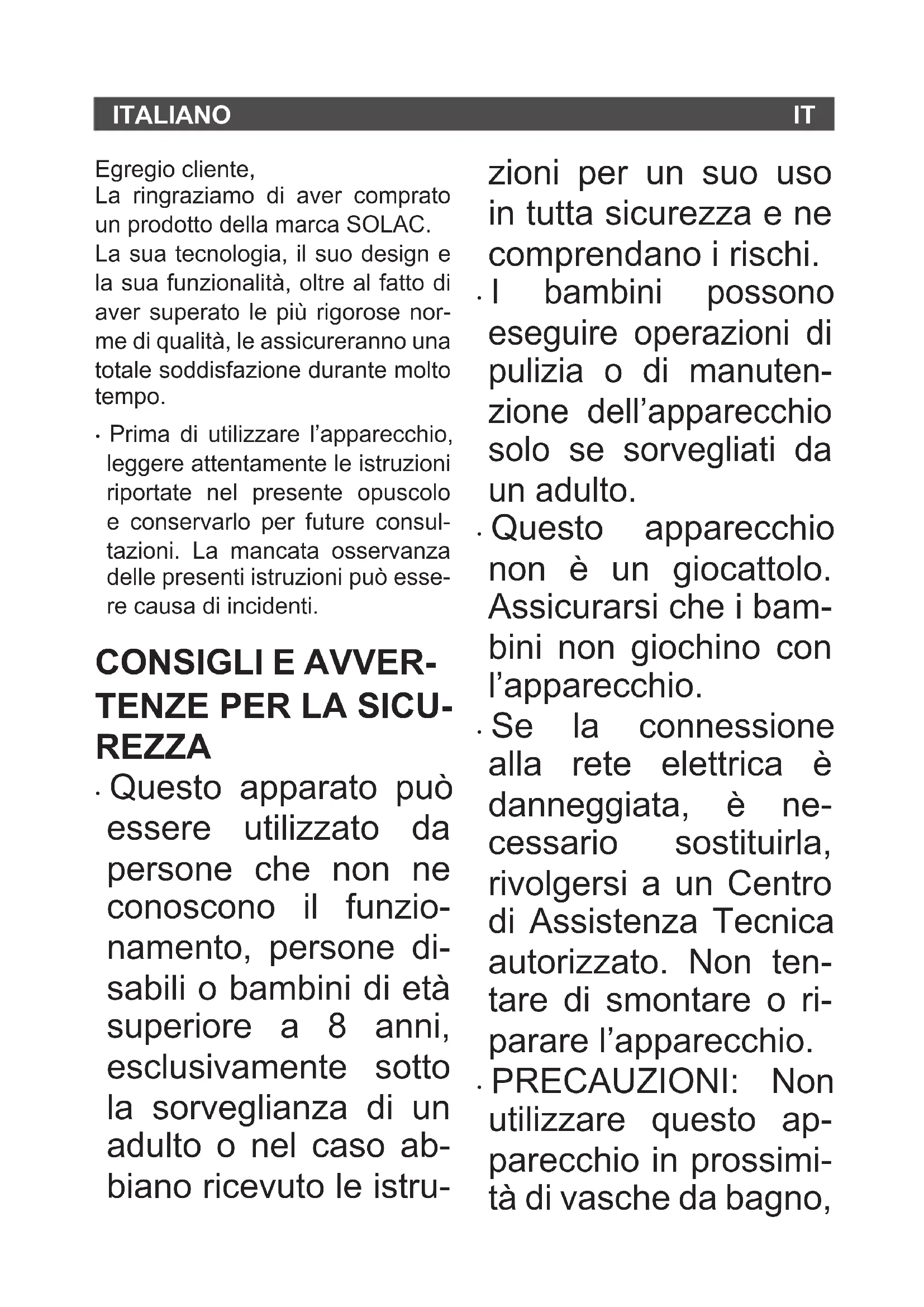 - Questo apparecchio è destinato unicamente all’uso domestico, non professionale o industriale.