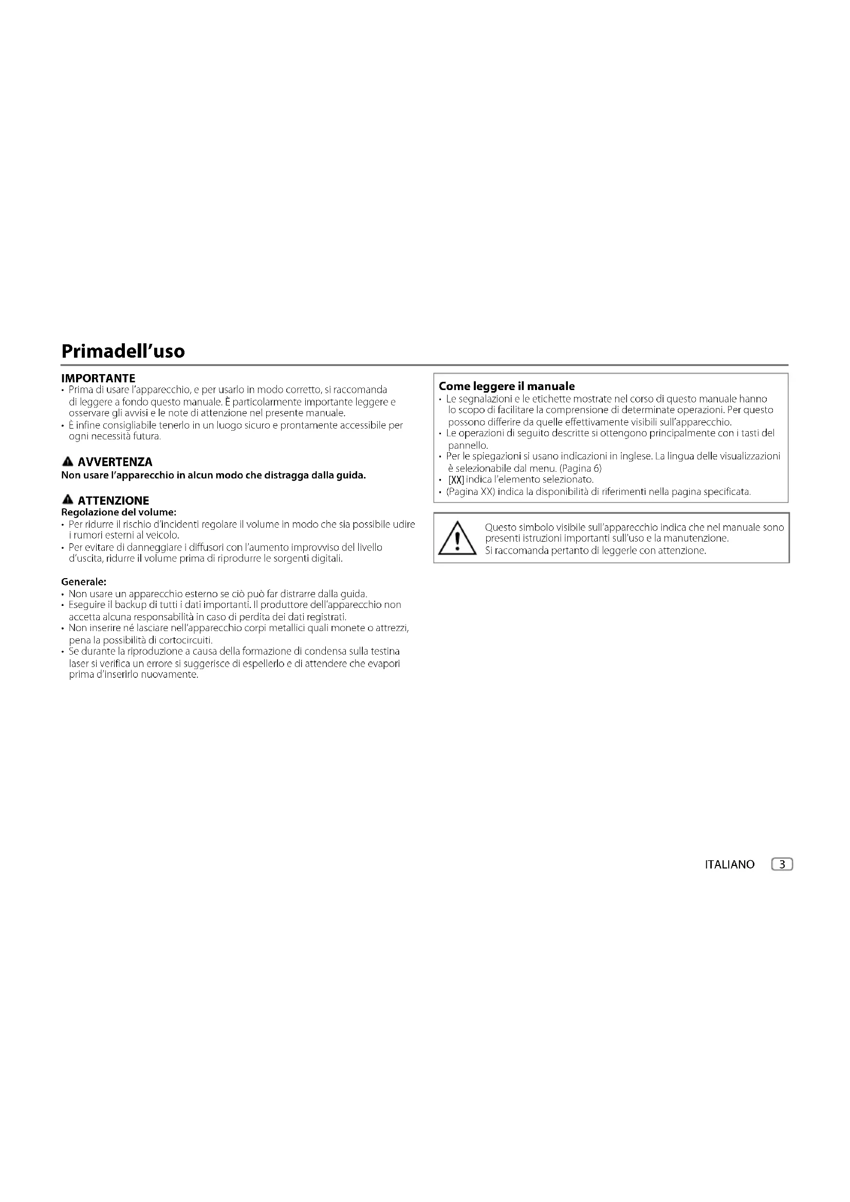 - Prima di usare l’apparecchio, e per usarlo in modo corretto, si raccomanda di leggere a fondo questo manuale. È particolarmente importante leggere e osservare gli avvisi e le note di attenzione nel presente manuale.