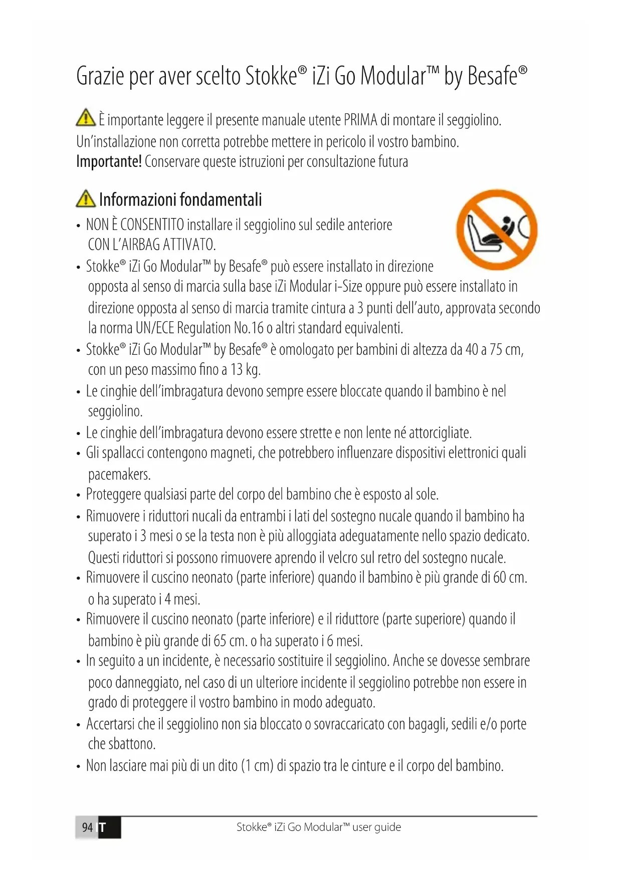 - Per qualsiasi dubbio, consultare il produttore del seggiolino auto o il rivenditore.Stokke® iZi Go Modular™ user guide 96 IT Preparazione all’installazione