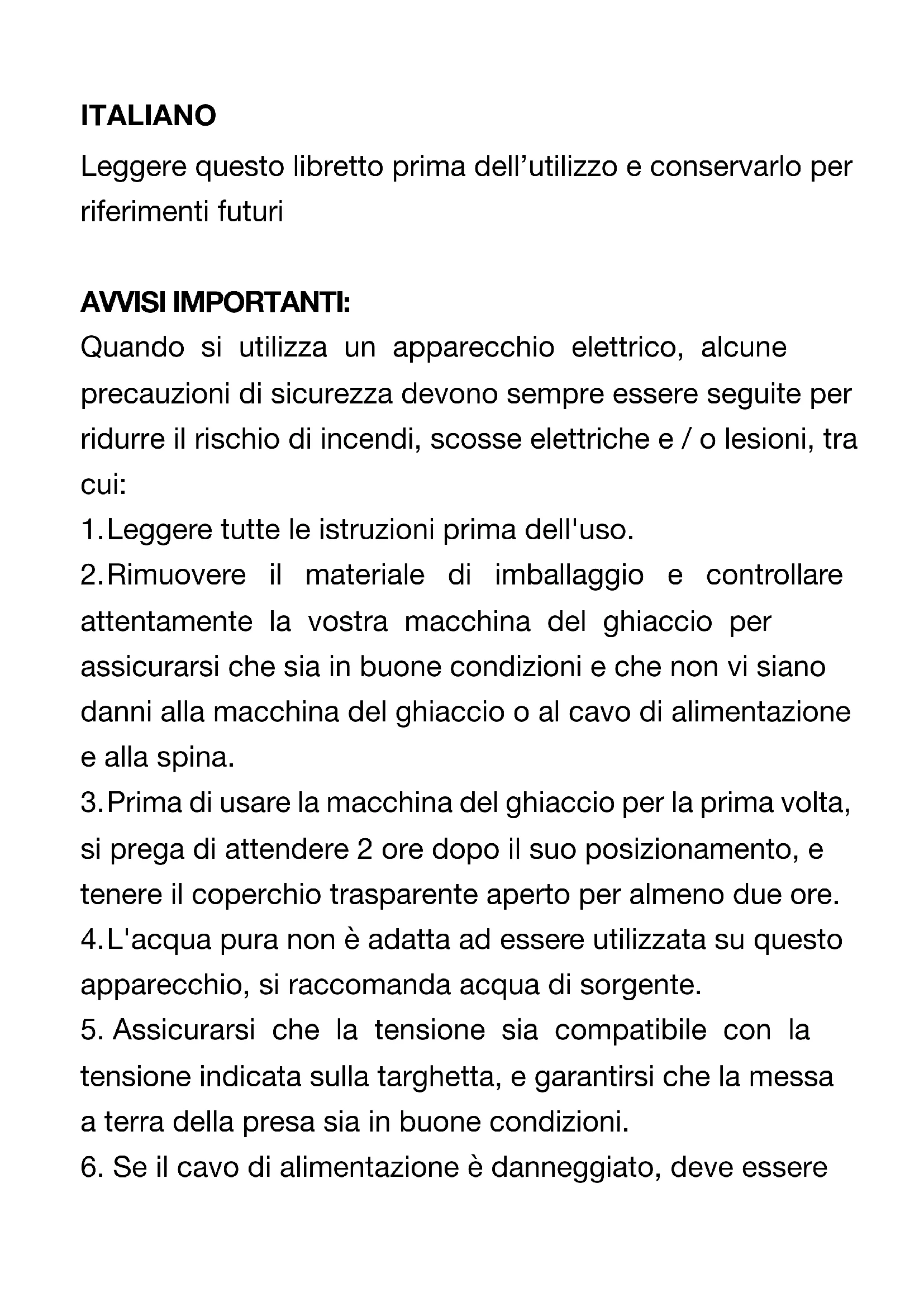 2.Rimuovere il materiale di imballaggio e controllare attendamente la vostra macchina del ghiaccio per assicurarsi che sia in buone condizioni e che non vi siano danni alla macchina del ghiaccio o al cavo di alimentazione e alla spina. - Prima di usare la macchina del ghiaccio per la prima volta, si prega di attendere 2 ore dopo il suo posizionamento, etenere il coperchio trasparente aperto per almeno due ore.