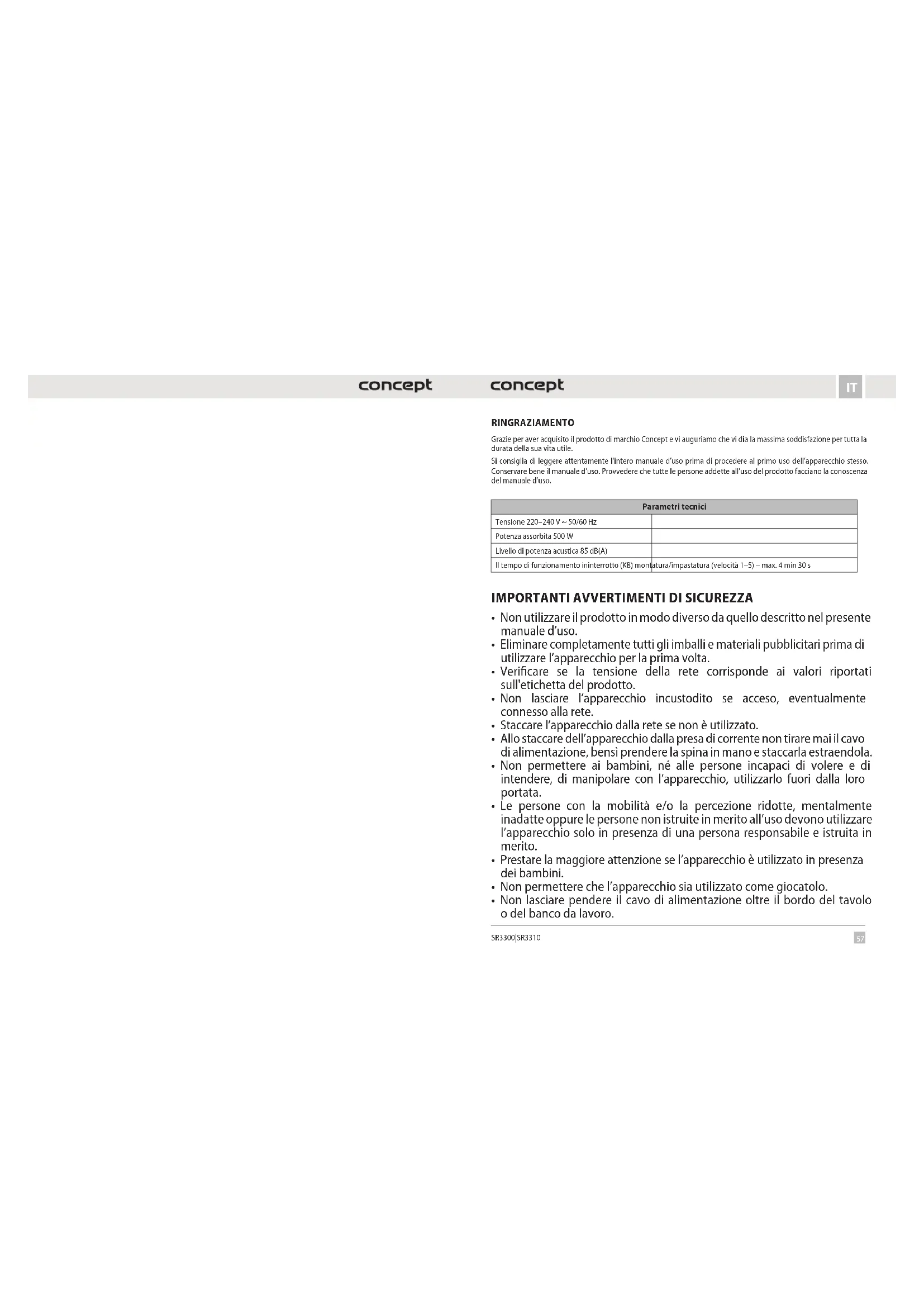 SR3300|SR3310 RINGRAZIAMENTO Grazie per aver acquisito il prodotto di marchio Concept e vi auguriamo che vi dia la massima soddisfazione per tutta la durata della sua vita utile. Si consiglia di leggere attentamente l’intero manuale d’uso prima di procedere al primo uso dell’apparecchio stesso. Conservare bene il manuale d’uso. Provvedere che tutte le persone addette all’uso del prodotto facciano la conoscenza del manuale d’uso. Parametri tecnici Tensione 220–240 V ~ 50/60 Hz Potenza assorbita 500 W Livello di potenza acustica 85 dB(A) Il tempo di funzionamento ininterrotto (KB) montatura/impastatura (velocità 1–5) – max. 4 min 30 s