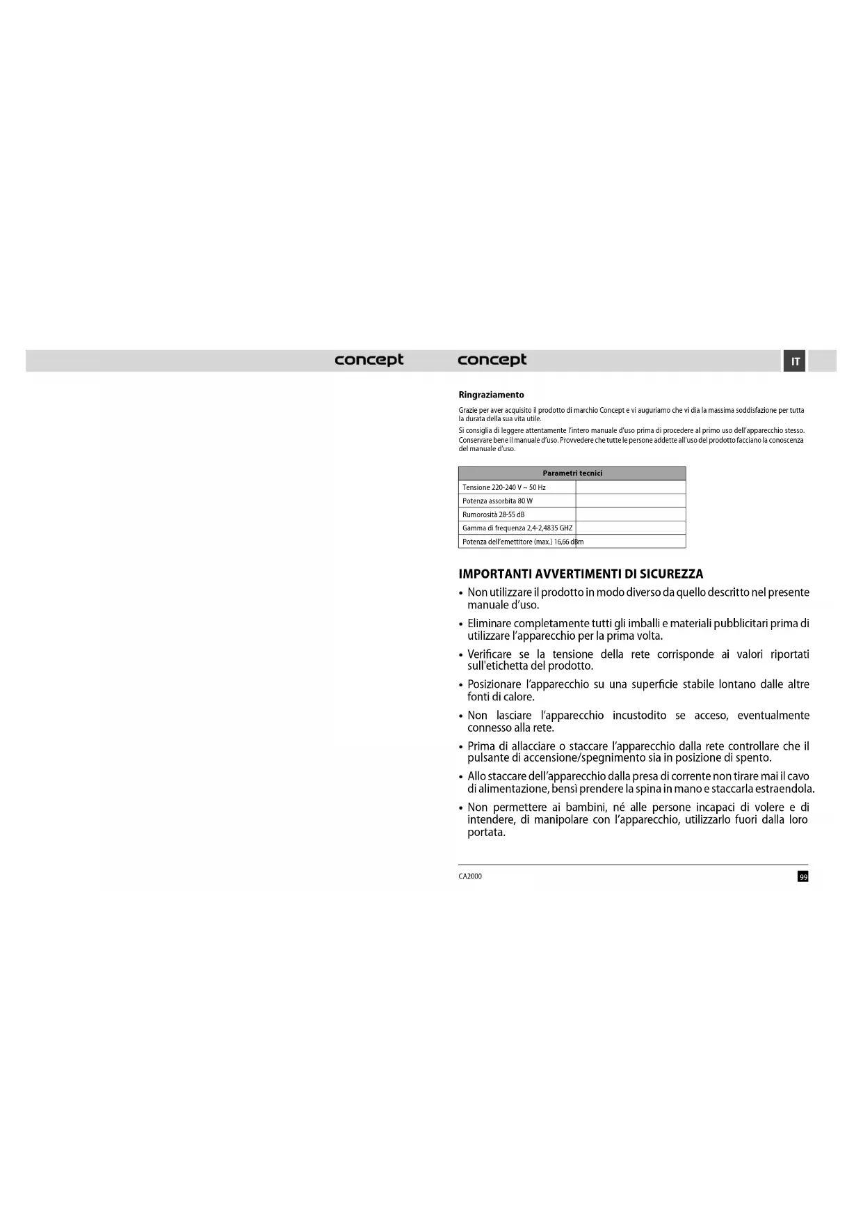 CA2000 Ringraziamento Grazie per aver acquisito il prodotto di marchio Concept e vi auguriamo che vi dia la massima soddisfazione per tutta la durata della sua vita utile. Si consiglia di leggere attentamente l’intero manuale d’uso prima di procedere al primo uso dell’apparecchio stesso. Conservare bene il manuale d’uso. Provvedere che tutte le persone addette all’uso del prodotto facciano la conoscenza del manuale d’uso. Parametri tecnici Tensione 220-240 V ~ 50 Hz Potenza assorbita 80 W Rumorosità 28-55 dB Gamma di frequenza 2,4-2,4835 GHZ Potenza dell’emettitore (max.) 16,66 dBm