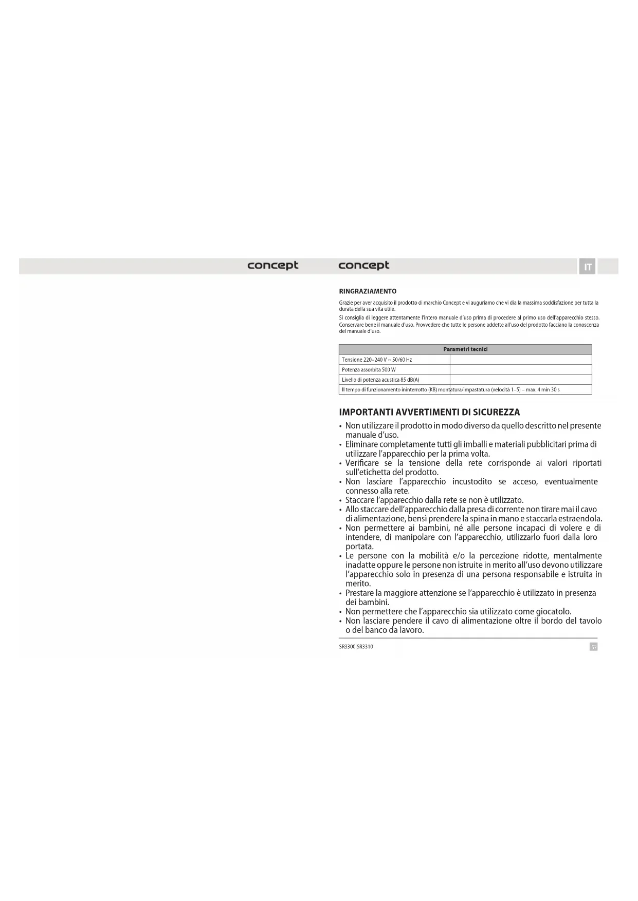 SR3300|SR3310 RINGRAZIAMENTO Grazie per aver acquisito il prodotto di marchio Concept e vi auguriamo che vi dia la massima soddisfazione per tutta la durata della sua vita utile. Si consiglia di leggere attentamente l’intero manuale d’uso prima di procedere al primo uso dell’apparecchio stesso. Conservare bene il manuale d’uso. Provvedere che tutte le persone addette all’uso del prodotto facciano la conoscenza del manuale d’uso. Parametri tecnici Tensione 220–240 V ~ 50/60 Hz Potenza assorbita 500 W Livello di potenza acustica 85 dB(A) Il tempo di funzionamento ininterrotto (KB) montatura/impastatura (velocità 1–5) – max. 4 min 30 s