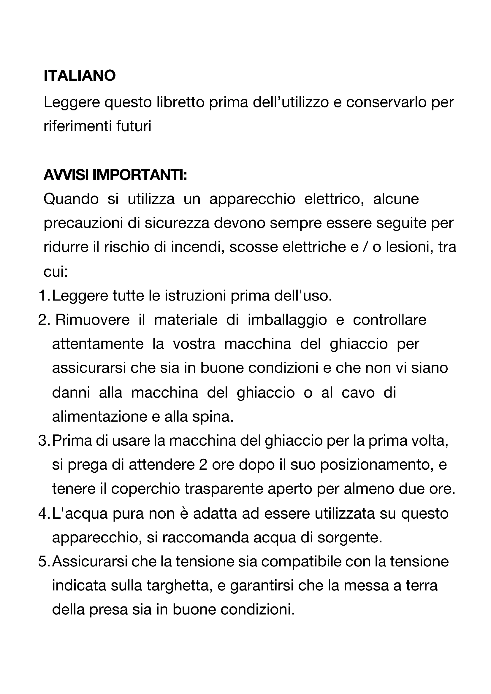 - Prima di usare la macchina del ghiaccio per la prima volta, si prega di attendere 2 ore dello sua posizionamento, e tenere il coperchio trasparente aperto per almeno due ore.