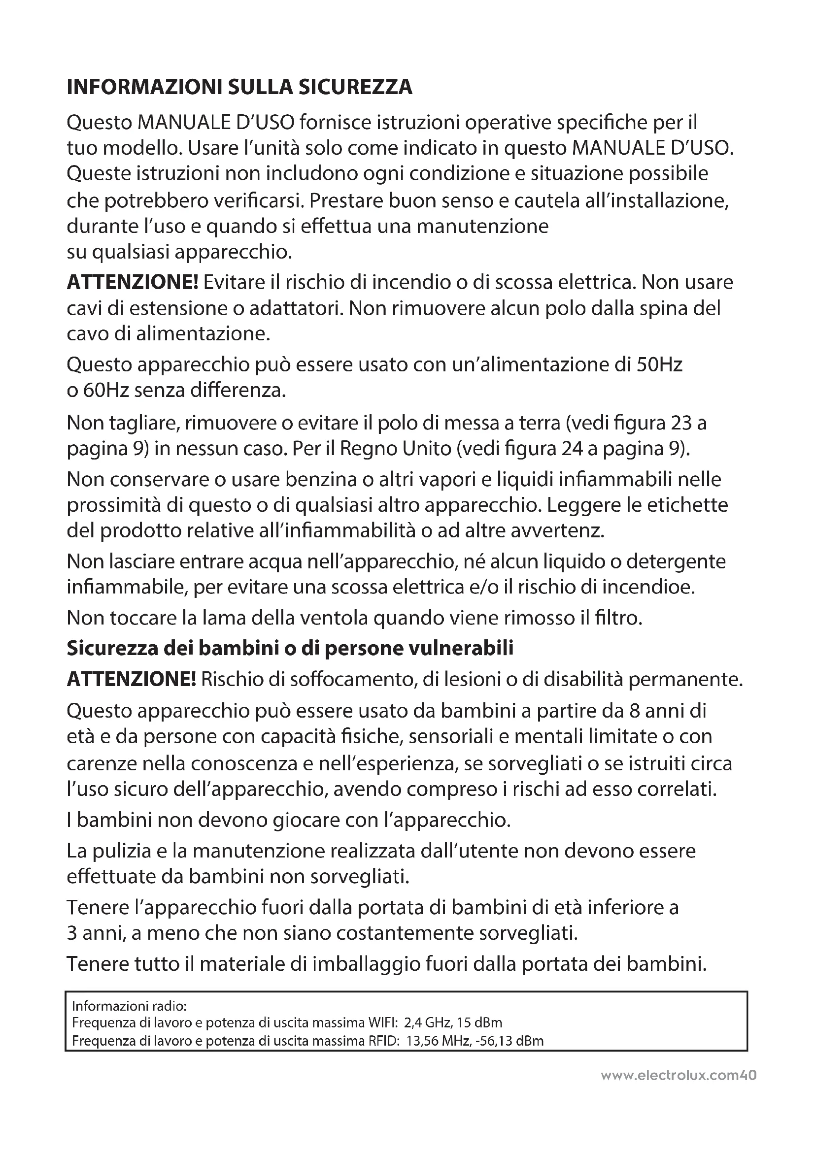 Questo MANUALE D’USO fornisce istruzioni operative speciche per il tuo modello. Usare l’unità solo come indicato in questo MANUALE D’USO. Queste istruzioni non includono ogni condizione e situazione possibile che potrebbero vericarsi. Prestare buon senso e cautela all’installazione, durante l’uso e quando si eettua una manutenzione su qualsiasi apparecchio. ATTENZIONE! Evitare il rischio di incendio o di scossa elettrica. Non usare cavi di estensione o adattatori. Non rimuovere alcun polo dalla spina del cavo di alimentazione. Questo apparecchio può essere usato con un’alimentazione di 50Hz o 60Hz senza dierenza. Non tagliare, rimuovere o evitare il polo di messa a terra (vedi gura 23 a pagina 9) in nessun caso. Per il Regno Unito (vedi gura 24 a pagina 9). Non conservare o usare benzina o altri vapori e liquidi inammabili nelle prossimità di questo o di qualsiasi altro apparecchio. Leggere le etichette del prodotto relative all’inammabilità o ad altre avvertenz. Non lasciare entrare acqua nell’apparecchio, né alcun liquido o detergente inammabile, per evitare una scossa elettrica e/o il rischio di incendioe. Non toccare la lama della ventola quando viene rimosso il ltro. Sicurezza dei bambini o di persone vulnerabili ATTENZIONE! Rischio di soocamento, di lesioni o di disabilità permanente. Questo apparecchio può essere usato da bambini a partire da 8 anni di età e da persone con capacità siche, sensoriali e mentali limitate o con carenze nella conoscenza e nell’esperienza, se sorvegliati o se istruiti circa l’uso sicuro dell’apparecchio, avendo compreso i rischi ad esso correlati. I bambini non devono giocare con l’apparecchio. La pulizia e la manutenzione realizzata dall’utente non devono essere eettuate da bambini non sorvegliati. Tenere l’apparecchio fuori dalla portata di bambini di età inferiore a 3 anni, a meno che non siano costantemente sorvegliati. Tenere tutto il materiale di imballaggio fuori dalla portata dei bambini. Informazioni radio: Frequenza di lavoro e potenza di uscita massima WIFI: 2,4 GHz, 15 dBm Frequenza di lavoro e potenza di uscita massima RFID: 13,56 MHz, -56,13 dBmwww.electrolux.com 41 Informazioni elettriche ATTENZIONE! Qualora non si fosse certi che la presa elettrica sia adeguatamente messa a terra o protetta da un fusibile temporizzato o da un interruttore automatico, far installare una presa adatta da un elettricista qualicato, secondo il NEC (codice elettrico nazionale) e secondo i codici e le ordinanze applicati a livello locale. Non utilizzare cavi di estensione o adattatori. Non disconnettere l’unità dall’alimentazione elettrica tirando il cavo di alimentazione. Aerrare sempre la spina fermamente e tirarla direttamente dalla presa. Non schiacciare, piegare o annodare il cavo di alimentazione. Non tagliare o danneggiare il cavo di alimentazione. Qualora il cavo di alimentazione fosse danneggiato, farlo sostituire solamente da un addetto all’assistenza autorizzato Electrolux. Questa unità contiene dei componenti che non possono essere riparabili dall’utente. Contattare sempre un addetto all’assistenza autorizzato Electrolux per eettuare riparazioni. Qualora il cavo di alimentazione fosse danneggiato, dovrà essere sostituito dal produttore, da un suo addetto all’assistenza o da persone similmente qualicate per evitare ogni rischio. Assicurarsi di disconnettere l’unità dall’alimentazione elettrica prima di eettuare la pulizia, per evitare scosse o rischi d’incendio. Precauzioni di sicurezza ATTENZIONE! Non inserire o posizionare le dita o oggetti nell’area di scarico dell’aria o nella griglia frontale dell’unità. Non accendere o spegnere l’unità disconnettendo il cavo di alimentazione o disattivando la corrente dal quadro elettrico. In caso di malfunzionamento (scintille, odore di bruciato, ecc.) fermare immediatamente l’attività, disconnettere il cavo di alimentazione e contattare un addetto all’assistenza Electrolux autorizzato. Non utilizzare l’unità con le mani bagnate. Non tirare il cavo di alimentazione. ATTENZIONE! Evitare lesioni o danneggiamenti all’unità o ad altre proprietà. Non dirigere il usso d’aria verso camini o altre fonti di calore, poiché potrebbero divampare delle amme. Non salire sull’unità, né sistemare oggetti su di essa. Non appendere oggetti sull’unità. Non sistemare sull’unità contenitori con del liquido al loro interno. Spegnere l’unità alla fonte energetica quando non viene utilizzata per un esteso periodo temporale. Utilizzare l’unità con il ltro dell’aria in sede. Non bloccare o coprire la griglia di aspirazione, l’area di scarico e le porte di sfogo dell’aria. Assicurarsi che ogni attrezzatura elettrica/elettronica si trovi ad almeno 30 cm dall’unità. SMALTIMENTO Questo simbolo sul prodotto o sul suo imballaggio indica che il prodotto non è da considerarsi un riuto domestico. Per riciclare il prodotto, portarlo presso un punto di raccolta uciale o presso un centro di assistenza Electrolux, che potrà rimuovere e riciclare la batteria e le componenti elettriche in maniera sicura e professionale. Seguire le regole del proprio Paese relative alla raccolta riciclabili. ITALIANO Grazie per aver scelto il puricatore d’aria Electrolux PURE A9-40/PURE A9-60. Utilizzare sempre accessori e pezzi di ricambio originali per ottenere i migliori risultati. Questo prodotto è stato progettato considerando la salvaguardia ambientale. Tutte le componenti in plastica sono segnate per poter essere riciclate.