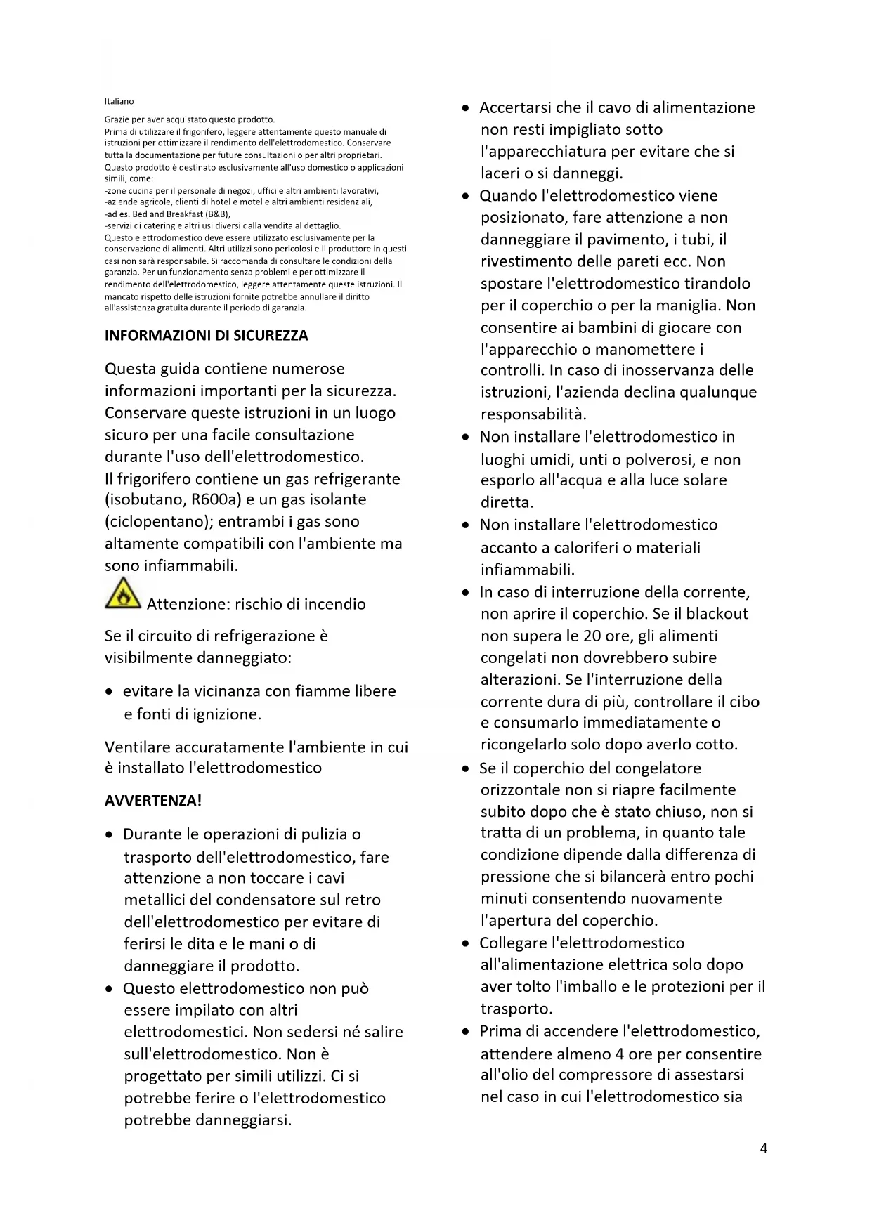 - Prima di accendere l'elettrodomestico, attendere almeno 4 ore per consentire all'olio del compressore di assestarsi nel caso in cui l'elettrodomestico sia5 stato trasportato in posizione orizzontale.