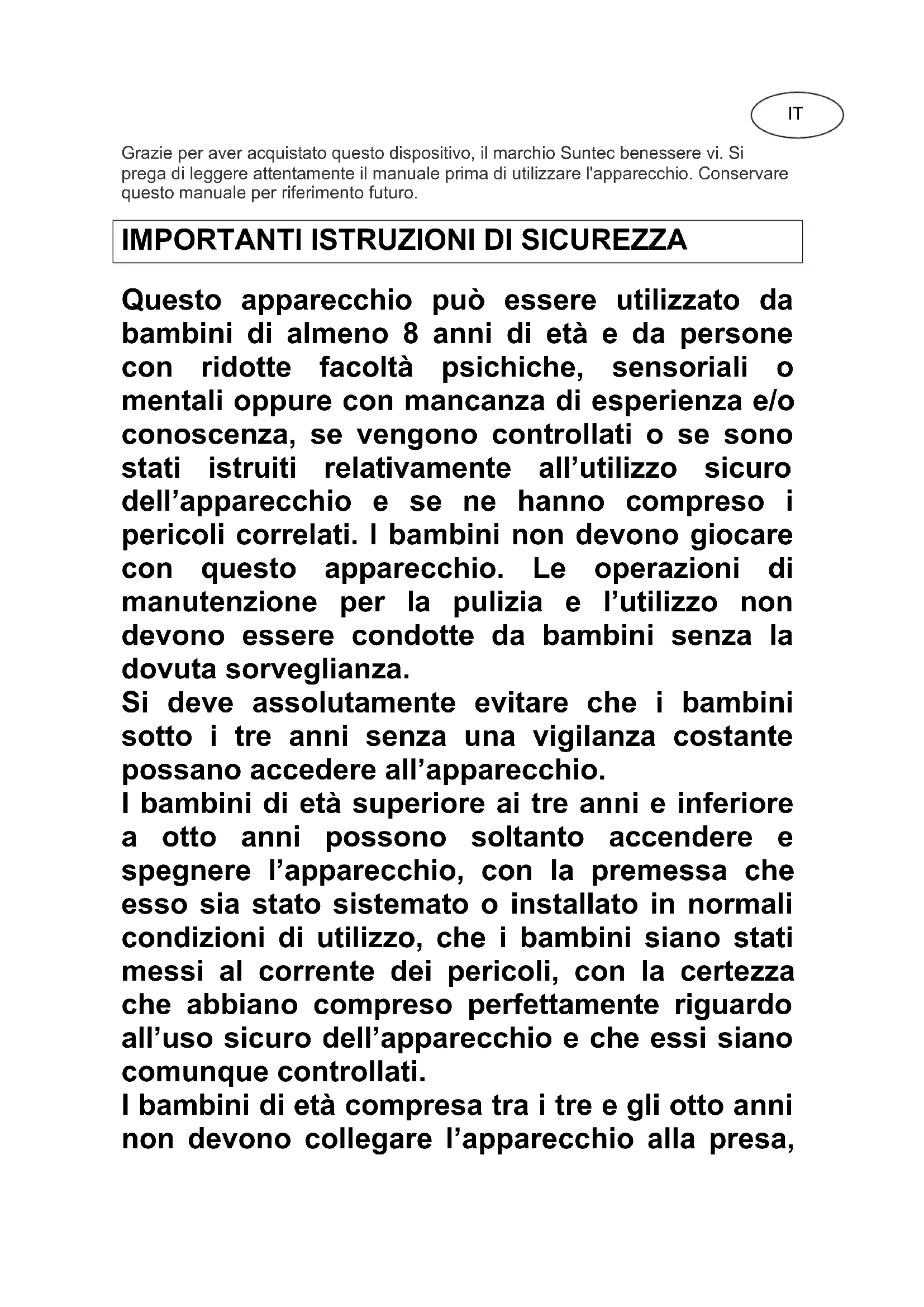 Questo apparecchio può essere utilizzato da bambini di almeno 8 anni di età e da persone con ridotte facoltà psichiche, sensoriali o mentali oppure con mancanza di esperienza e/o conoscenza, se vengono controllati o se sono stati istruiti relativamente all’utilizzo sicuro dell’apparecchio e se ne hanno compreso i pericoli correlati. I bambini non devono giocare con questo apparecchio. Le operazioni di manutenzione per la pulizia e l’utilizzo non devono essere condotte da bambini senza la dovuta sorveglianza. Si deve assolutamente evitare che i bambini sotto i tre anni senza una vigilanza costante possano accedere all’apparecchio. I bambini di età superiore ai tre anni e inferiore a otto anni possono soltanto accendere e spegnere l’apparecchio, con la premessa che esso sia stato sistemato o installato in normali condizioni di utilizzo, che i bambini siano stati messi al corrente dei pericoli, con la certezza che abbiano compreso perfettamente riguardo all’uso sicuro dell’apparecchio e che essi siano comunque controllati. I bambini di età compresa tra i tre e gli otto anni non devono collegare l’apparecchio alla presa, ITregolarlo, pulirlo oppure eseguire operazioni di manutenzione.