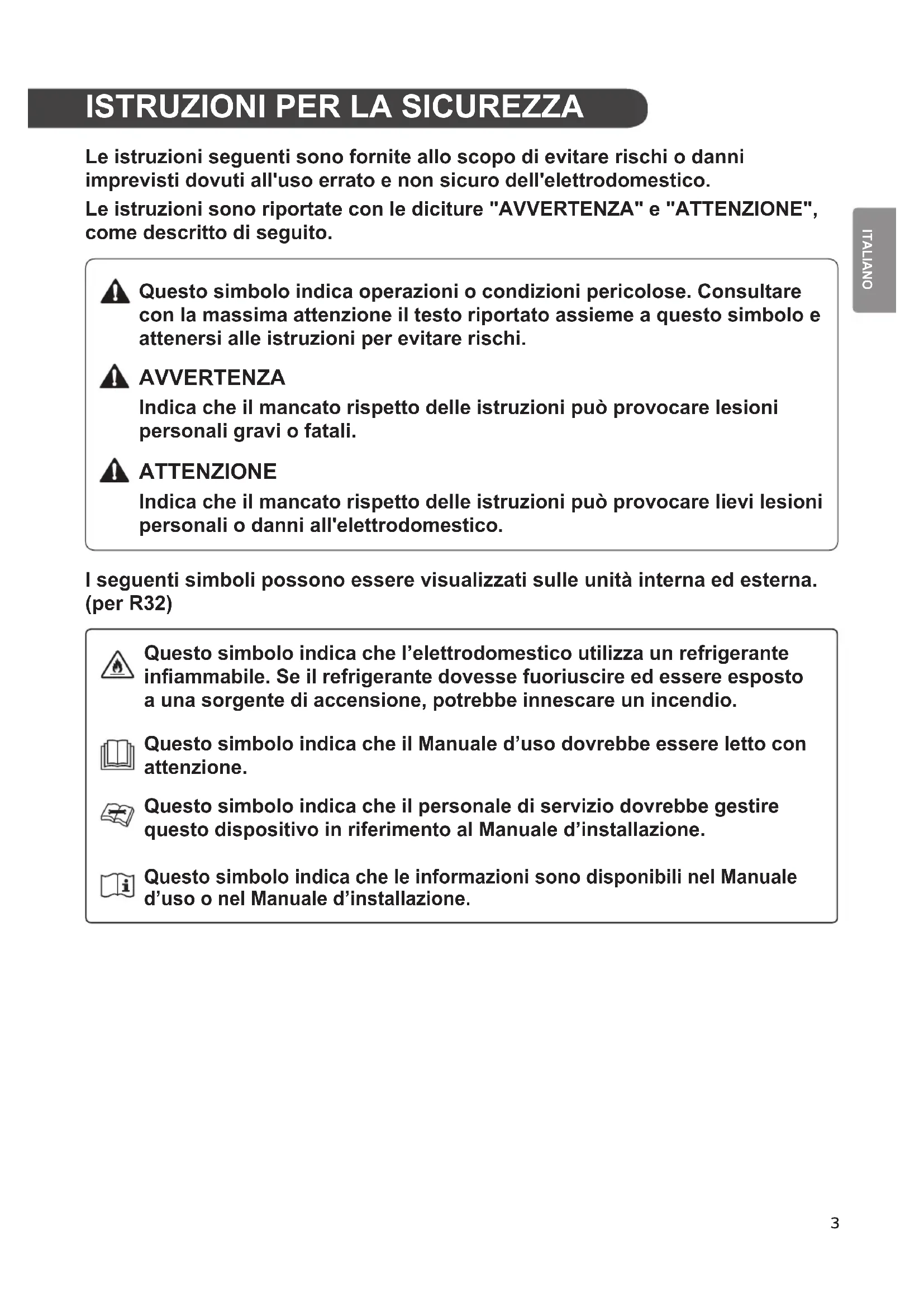 Le istruzioni seguenti sono fornite allo scopo di evitare rischi o danni imprevisti dovuti all'uso errato e non sicuro dell'elettrodomestico. Le istruzioni sono riportate con le diciture "AVVERTENZA" e "ATTENZIONE", come descritto di seguito. Questo simbolo indica operazioni o condizioni pericolose. Consultare con la massima attenzione il testo riportato assieme a questo simbolo e attenersi alle istruzioni per evitare rischi. AVVERTENZA Indica che il mancato rispetto delle istruzioni può provocare lesioni personali gravi o fatali. ATTENZIONE Indica che il mancato rispetto delle istruzioni può provocare lievi lesioni personali o danni all'elettrodomestico. I seguenti simboli possono essere visualizzati sulle unità interna ed esterna. (per R32) Questo simbolo indica che l’elettrodomestico utilizza un refrigerante infiammabile. Se il refrigerante dovesse fuoriuscire ed essere esposto a una sorgente di accensione, potrebbe innescare un incendio. Questo simbolo indica che il Manuale d’uso dovrebbe essere letto con attenzione. Questo simbolo indica che il personale di servizio dovrebbe gestire questo dispositivo in riferimento al Manuale d’installazione. Questo simbolo indica che le informazioni sono disponibili nel Manuale d’uso o nel Manuale d’installazione.4