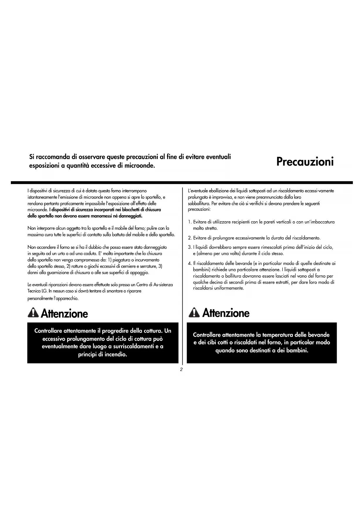 CON GRILLI dispositivi di sicurezza di cui è dotato questo forno interrompono istantaneamente l’emissione di microonde non appena si apre lo sportello, e rendono pertanto praticamente impossibile l’esposizione all’effetto delle microonde. I dispositivi di sicurezza incorporati nei blocchetti di chiusura dello sportello non devono essere manomessi né danneggiati. Non interporre alcun oggetto tra lo sportello e il mobile del forno; pulire con la massima cura tutte le superfici di contatto sulla battuta del mobile e dello sportello. Non accendere il forno se si ha il dubbio che possa essere stato danneggiato in seguito ad un urto o ad una caduta. E’ molto importante che la chiusura dello sportello non venga compromessa da: 1) piegatura o incurvamento dello sportello stesso, 2) rotture o giochi eccessivi di cerniere e serrature, 3) danni alla guarnizione di chiusura o alle sue superfici di appoggio. Le eventuali riparazioni devono essere effettuate solo presso un Centro di As-sistenza Tecnica LG. In nessun caso si dovrà tentare di smontare o riparare personalmente l’apparecchio. Attenzione Si raccomanda di osservare queste precauzioni al fine di evitare eventuali esposizioni a quantità eccessive di microonde. Precauzioni L’eventuale ebollizione dei liquidi sottoposti ad un riscaldamento eccessi-vamente prolungato è improvvisa, e non viene preannunciata dalla loro sobbollitura. Per evitare che ciò si verifichi si devono prendere le seguenti precauzioni: