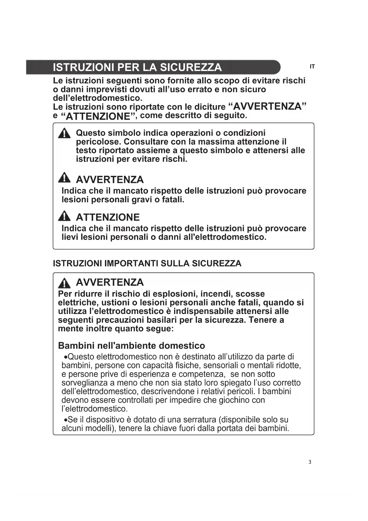 AVVERTENZA Per ridurre il rischio di esplosioni, incendi, scosse elettriche, ustioni o lesioni personali anche fatali, quando si utilizza l’elettrodomestico è indispensabile attenersi alle seguenti precauzioni basilari per la sicurezza. Tenere a mente inoltre quanto segue: Bambini nell'ambiente domestico